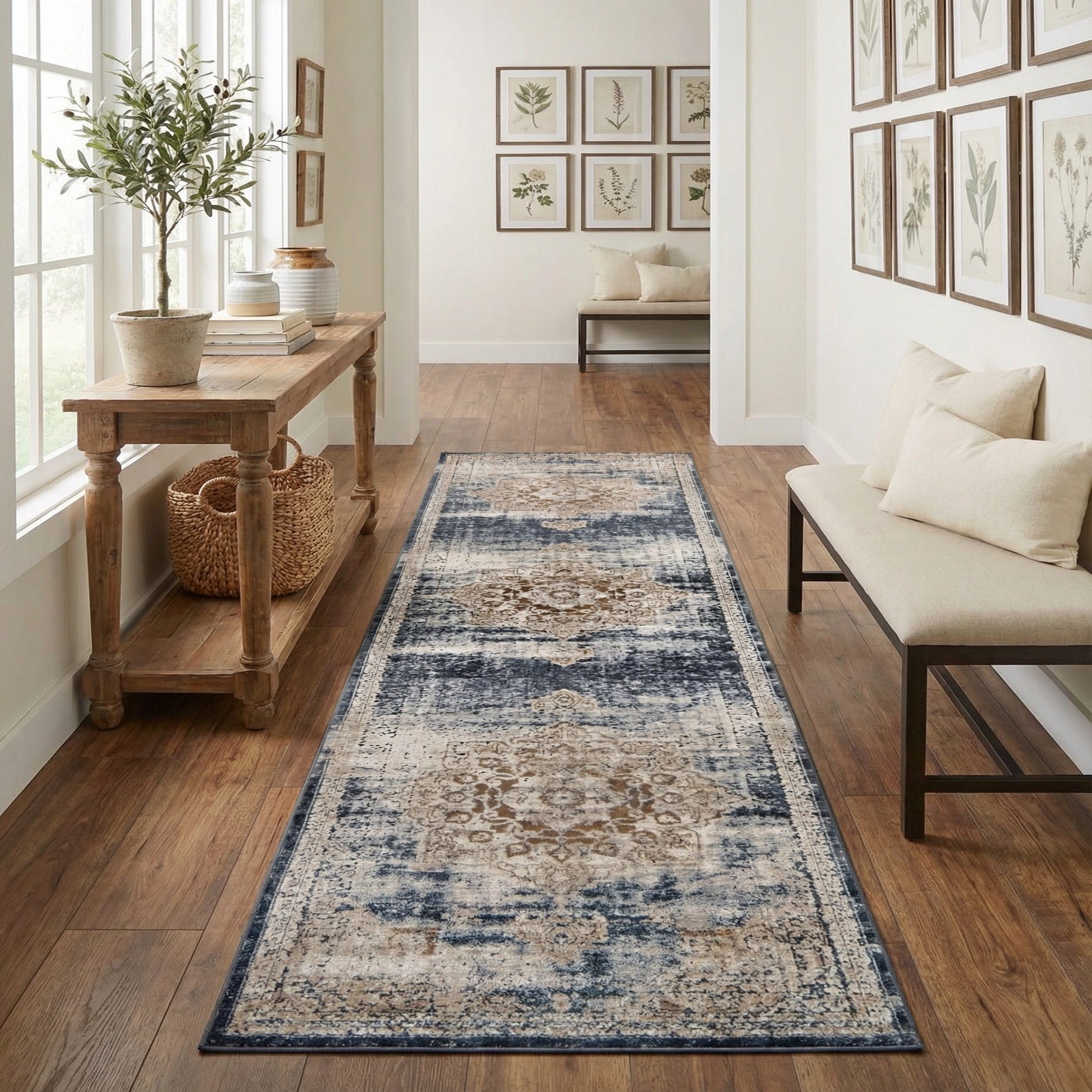 Primary color is Dark Blue. Colors in this rug include: Dark Blue, Beige, Blue, Gray, Ivory, Brown.