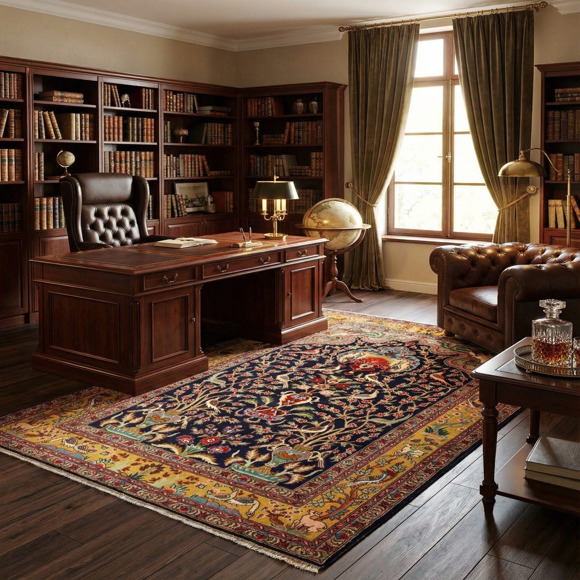 Primary color is Dark Blue. Colors in this rug include: Dark Blue, Dark Blue, Yellow, Grey, Red, Green, Pink, Cream, Blue.