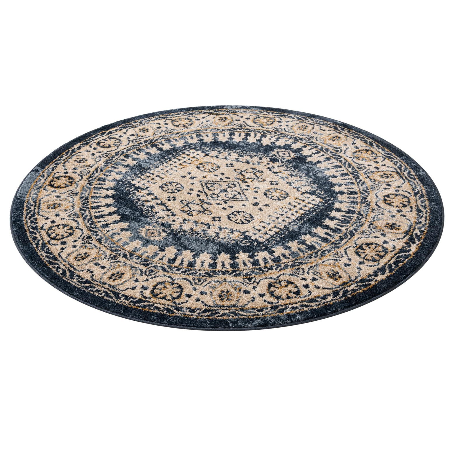 Primary color is Dark Blue. Colors in this rug include: Dark Blue, Gold, Ivory, Light Blue, Tan.
