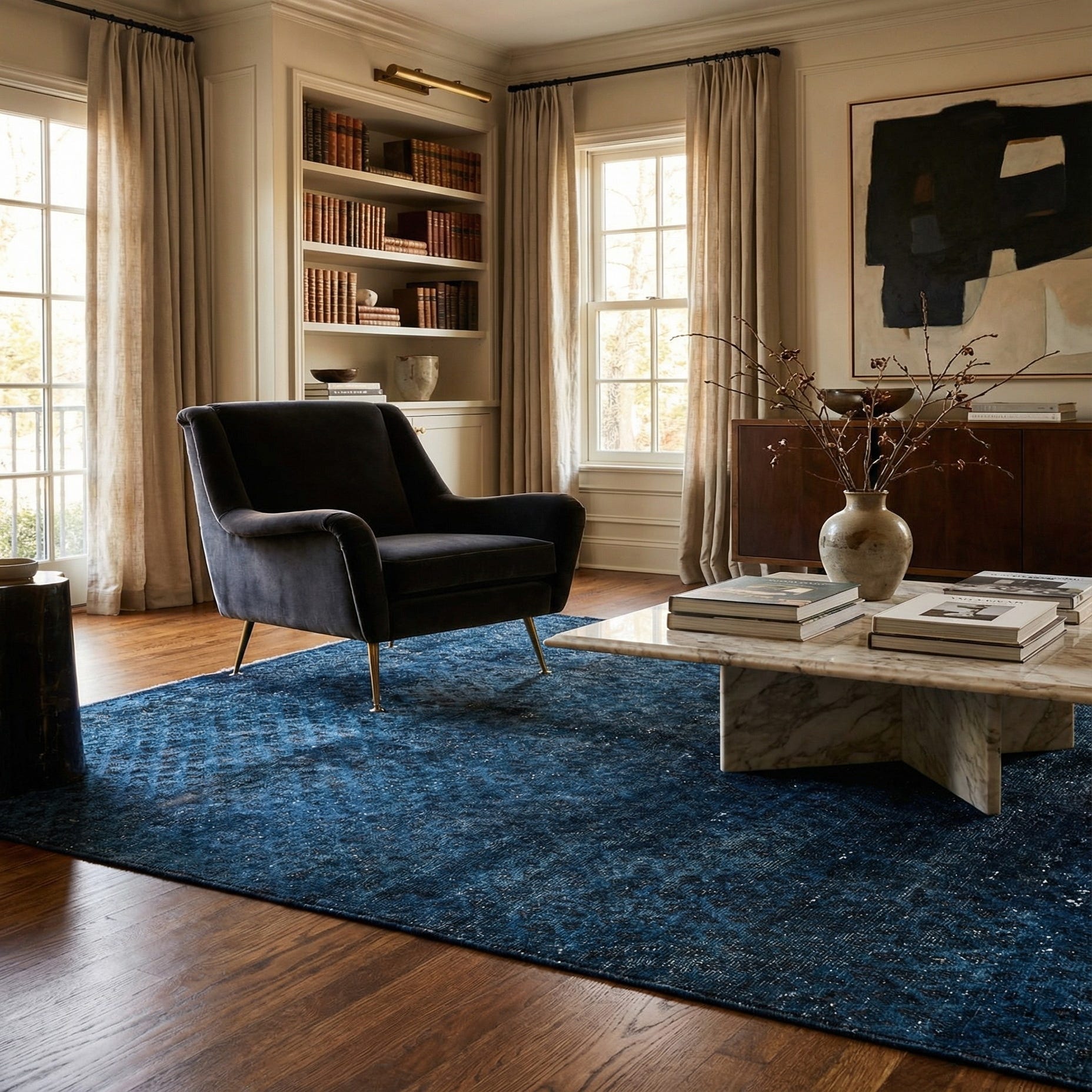 Primary color is Dark Blue. Colors in this rug include: Dark Blue, Black.