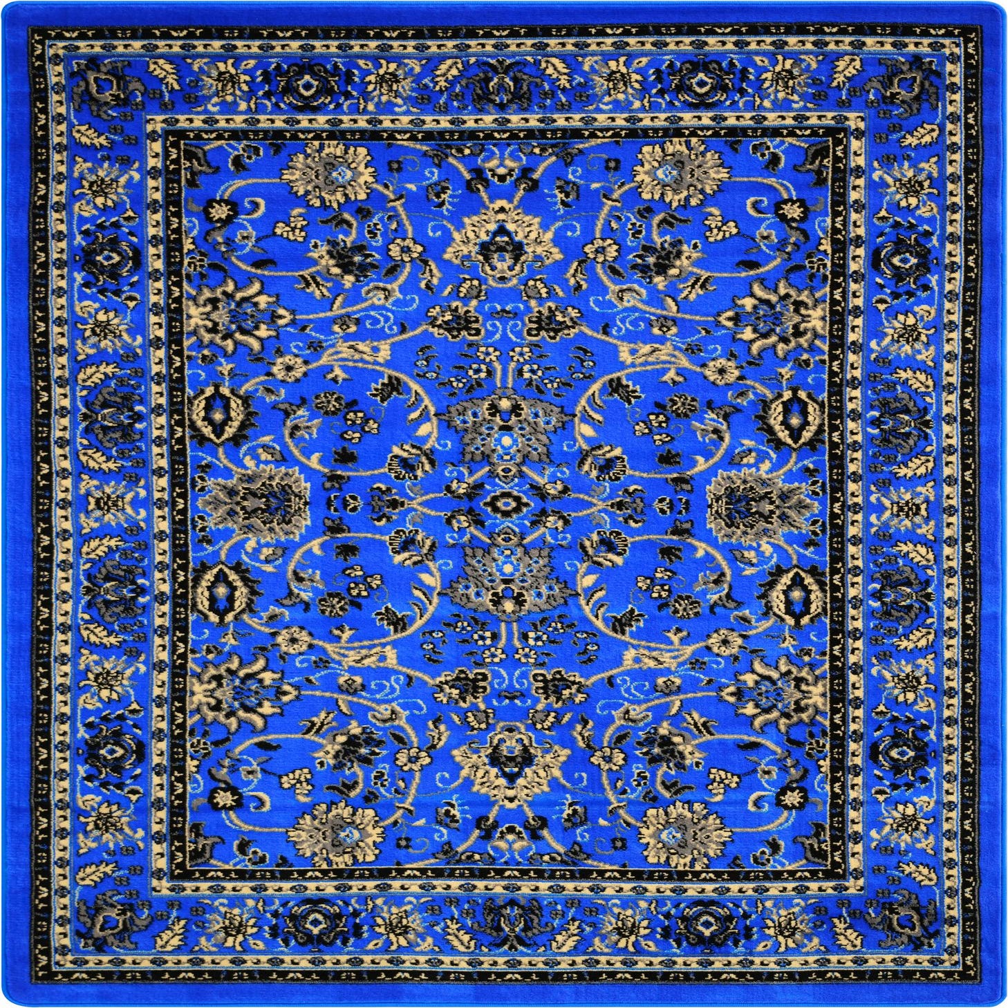 Primary color is Dark Blue. Colors in this rug include: Dark Blue, Beige, Black, Ivory.