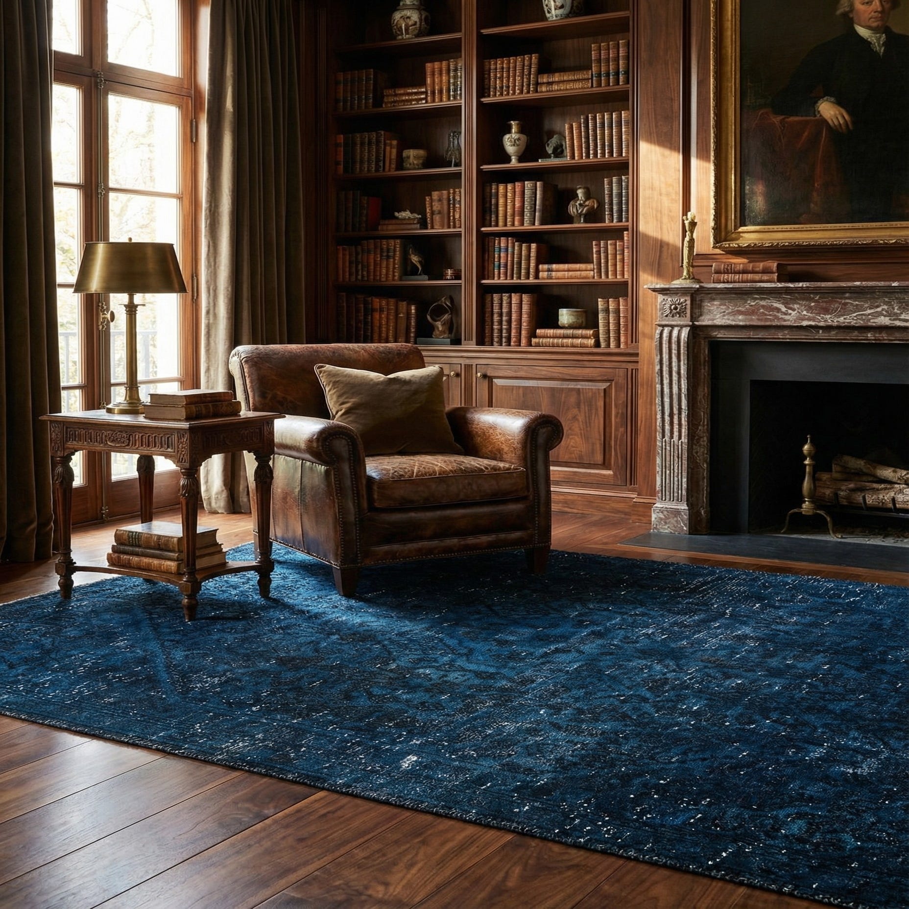 Primary color is Dark Blue. Colors in this rug include: Dark Blue, Black.