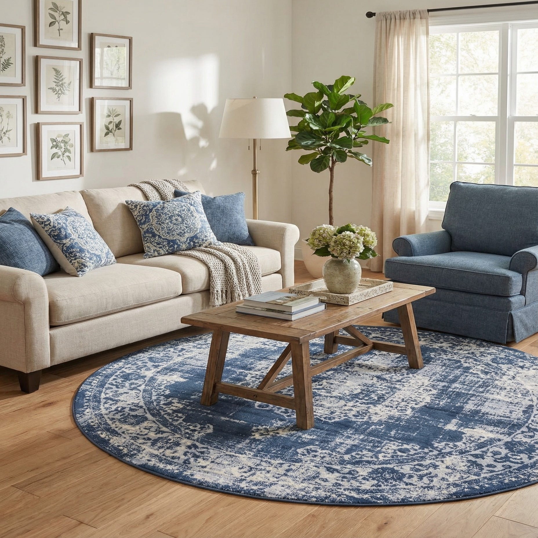 Primary color is Dark Blue. Colors in this rug include: Dark Blue, Ivory.