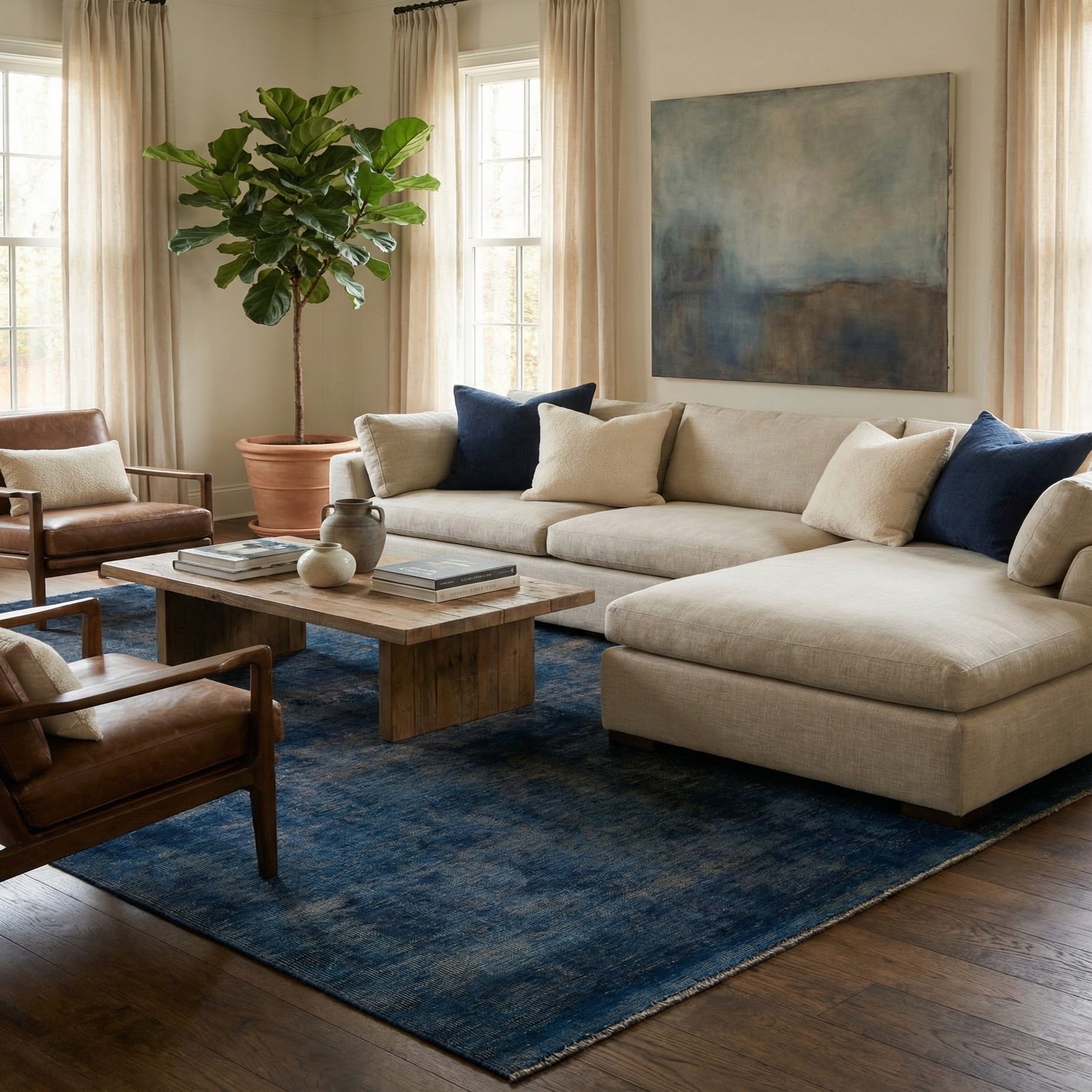 Primary color is Dark Blue. Colors in this rug include: Dark Blue, Beige, Black.