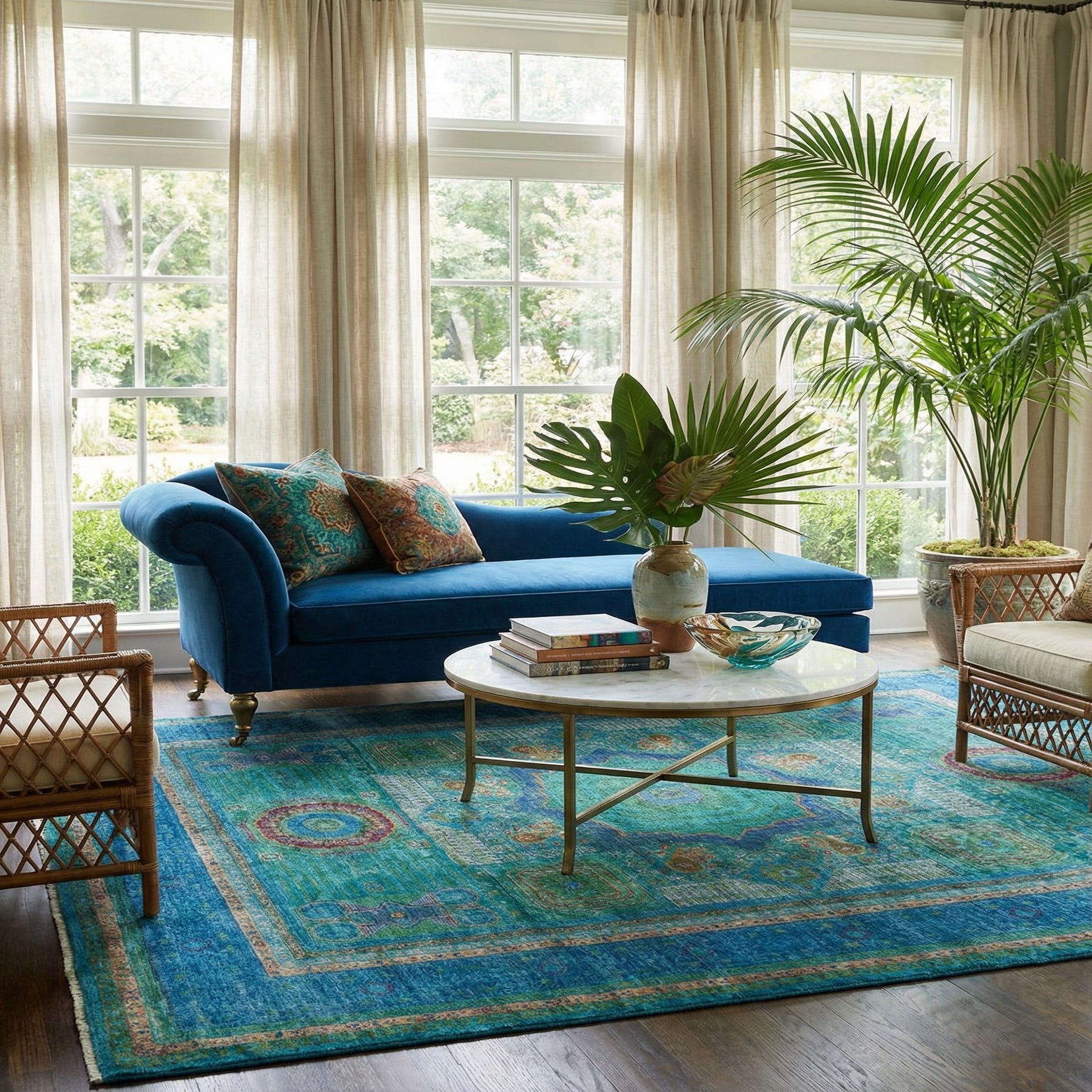 Primary color is Dark Blue. Colors in this rug include: Dark Blue, Green, Burgundy.