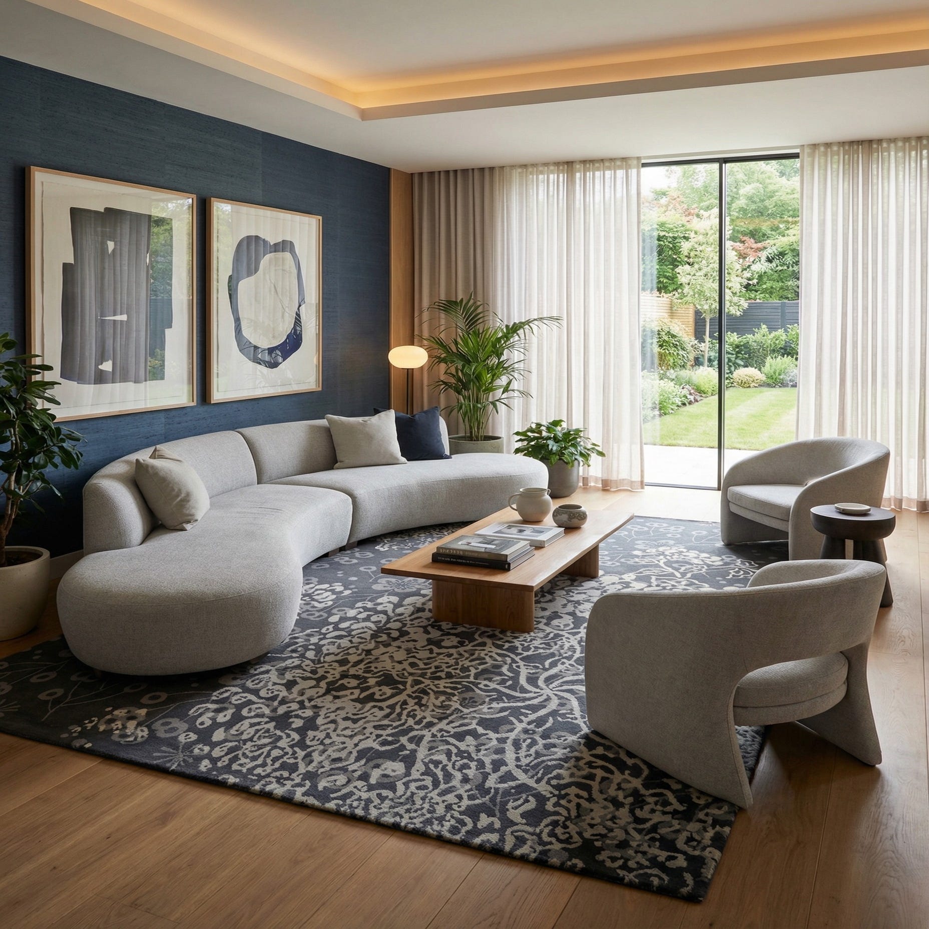 Primary color is Dark Blue. Colors in this rug include: Dark Blue, Grey.