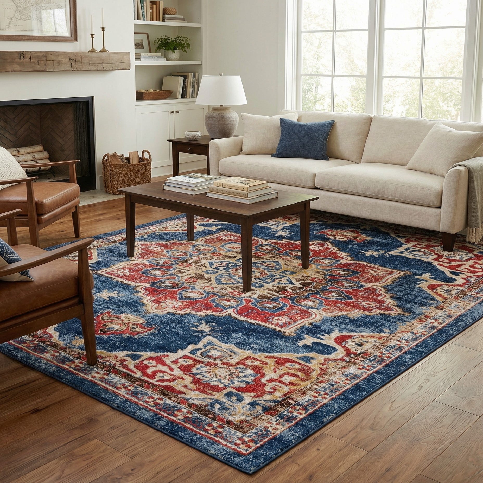 Primary color is Dark Blue. Colors in this rug include: Dark Blue, Beige, Cream, Light Blue, Orange, Rust Red, Gold.