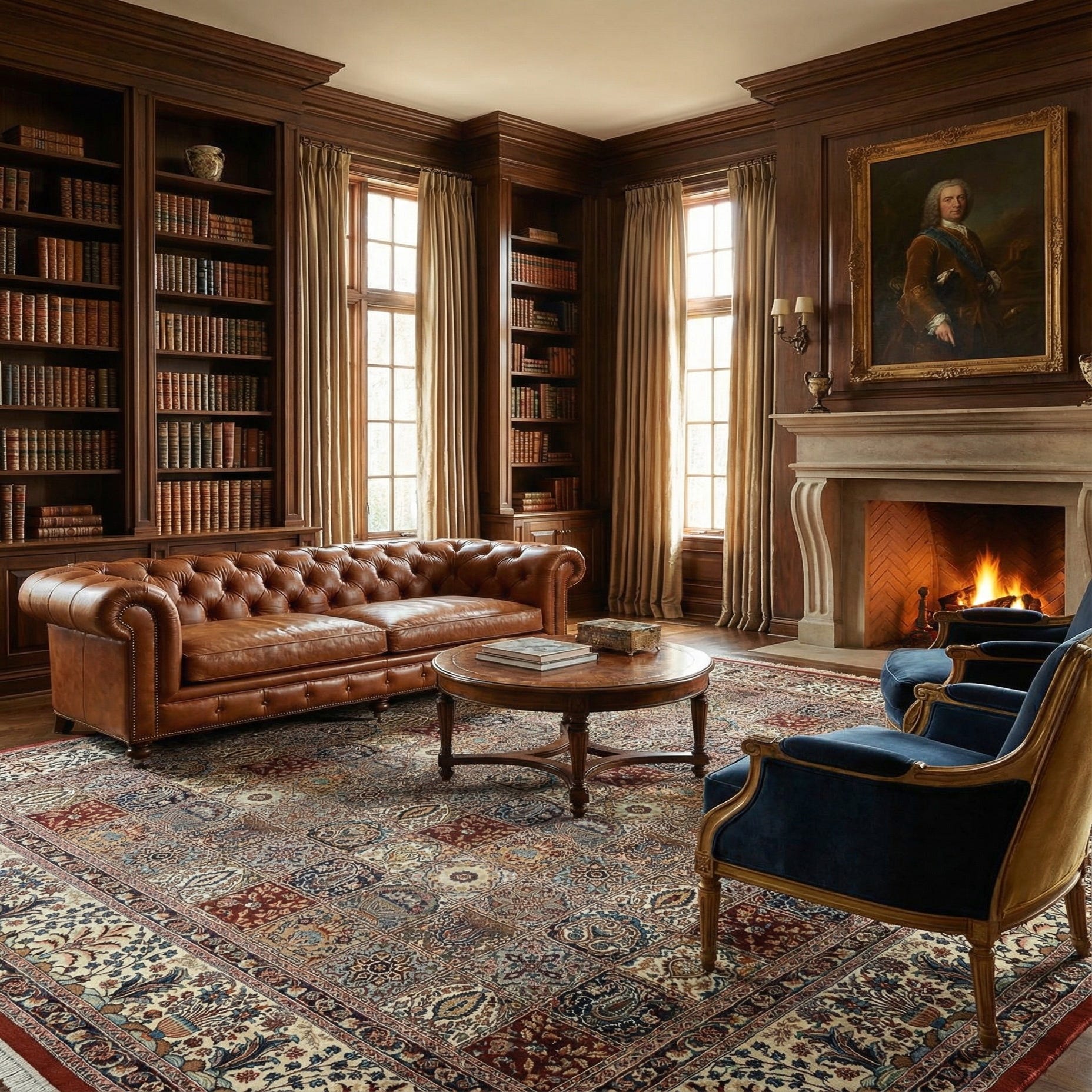 Primary color is Dark Blue. Colors in this rug include: Dark Blue, Dark Blue, Cream, Red, Green, Blue, Brown, Grey.
