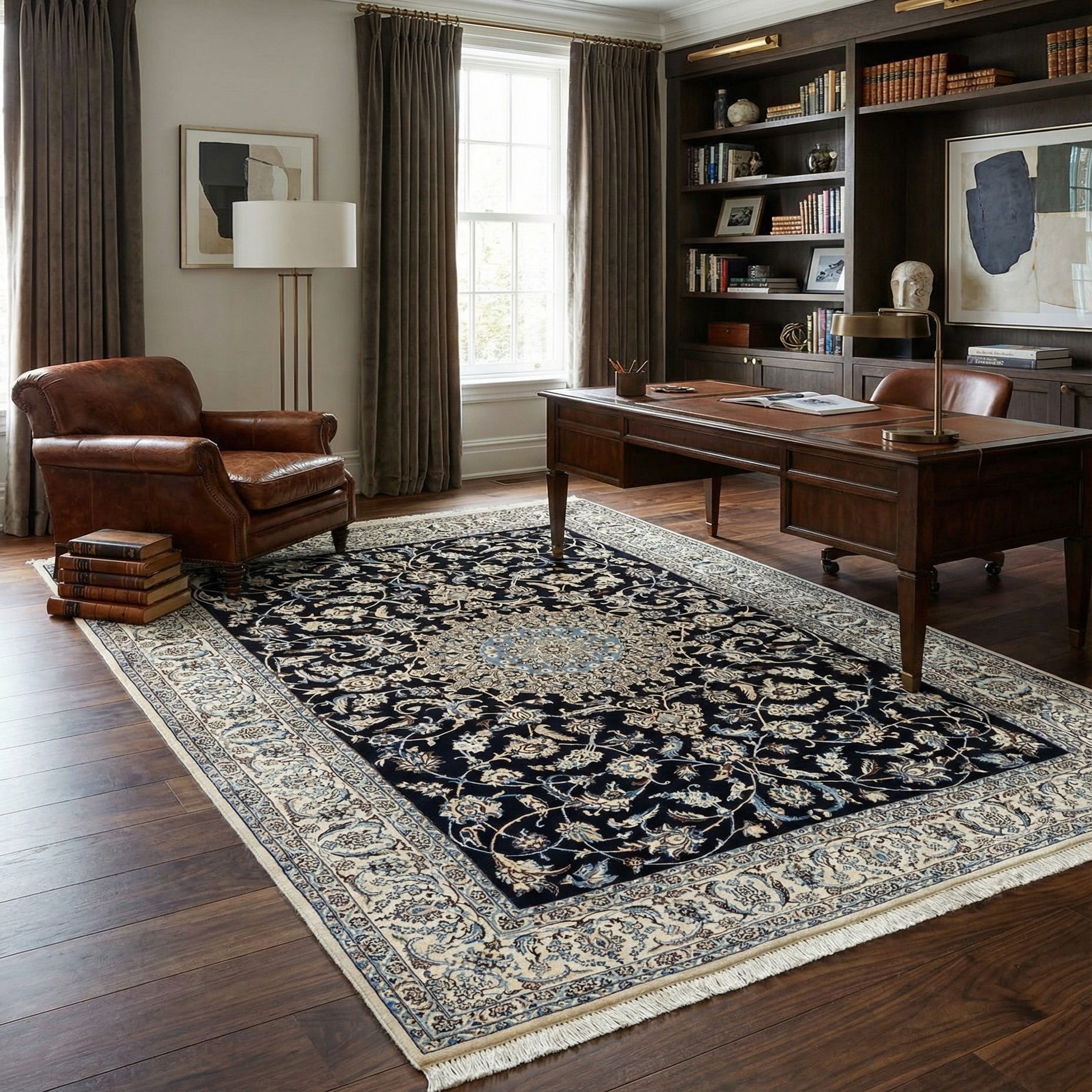 Primary color is Dark Blue. Colors in this rug include: Dark Blue, Dark Blue, Cream, Blue, Grey, Brown, Red, Beige.