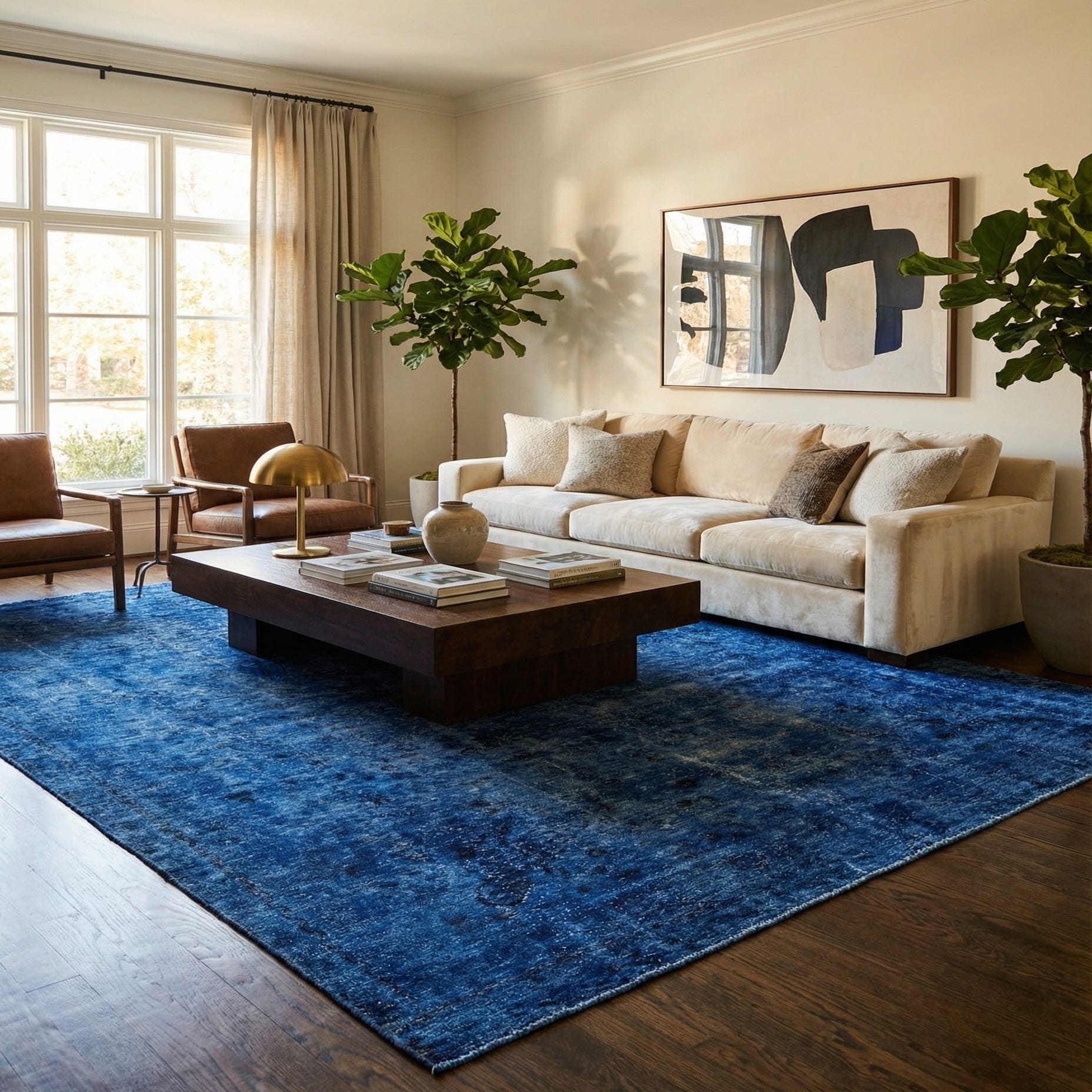 Primary color is Dark Blue. Colors in this rug include: Dark Blue, Blue, Ivory.