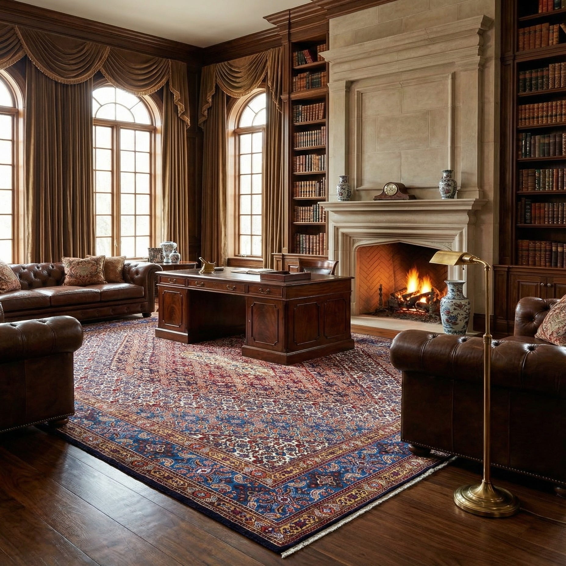 Primary color is Dark Blue. Colors in this rug include: Dark Blue, Dark Blue, Cream, Blue, Red, Orange, Brown, Beige, Green.