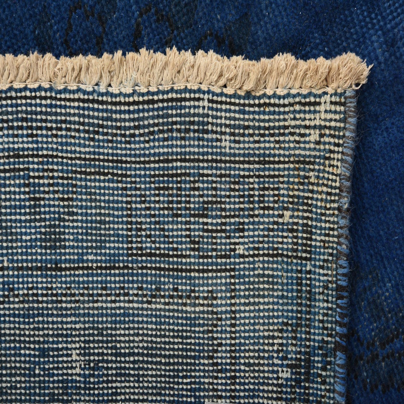 Primary color is Dark Blue. Colors in this rug include: Dark Blue, Black, Ivory.