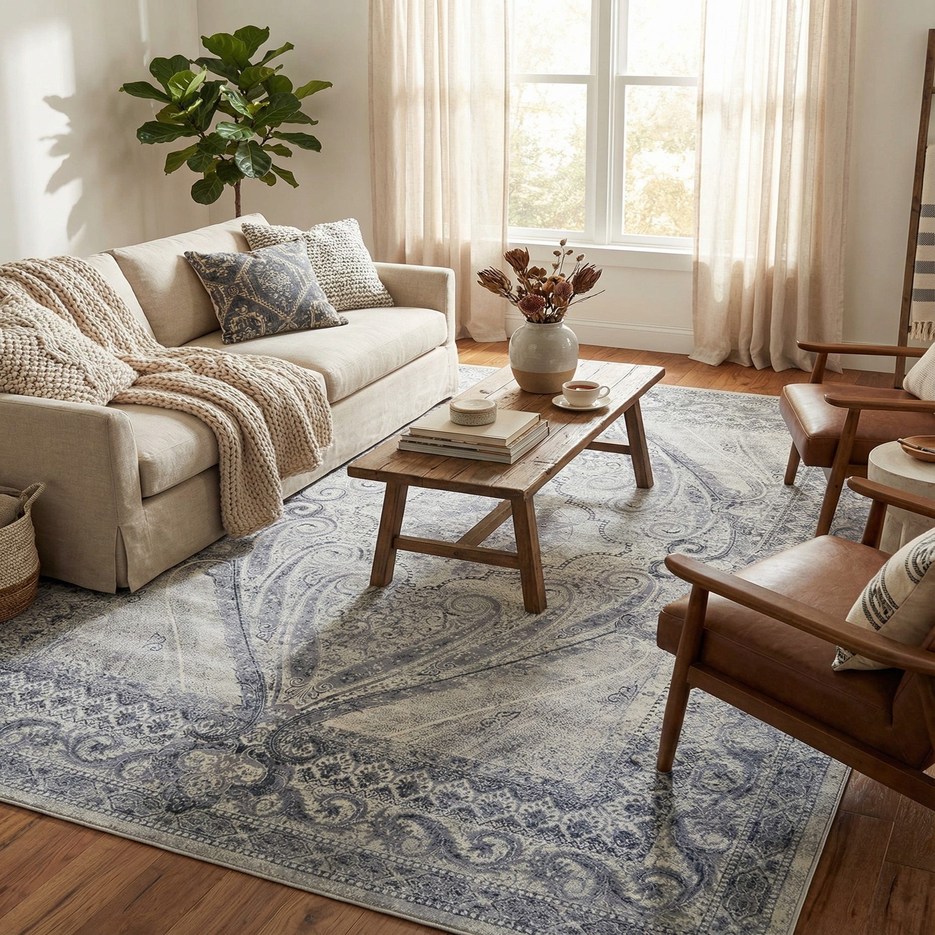 85% Polypropylene Heatset and 15% Chenille Yarn with 100% cotton backing for extra durability and softness. Pile textured for vintage look and feel