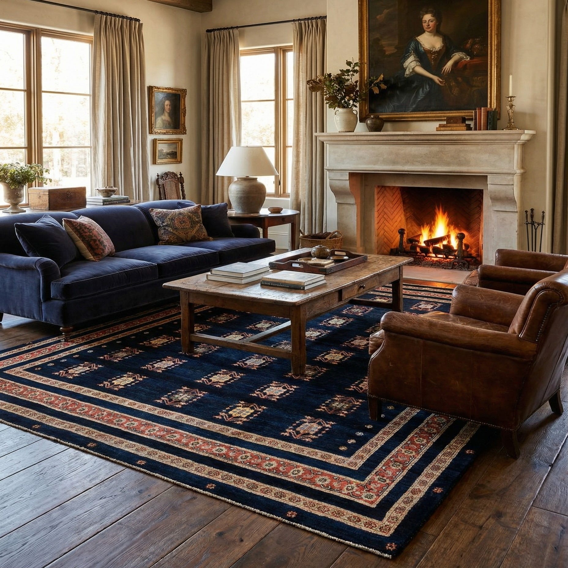 Primary color is Dark Blue. Colors in this rug include: Dark Blue, Rectangle.