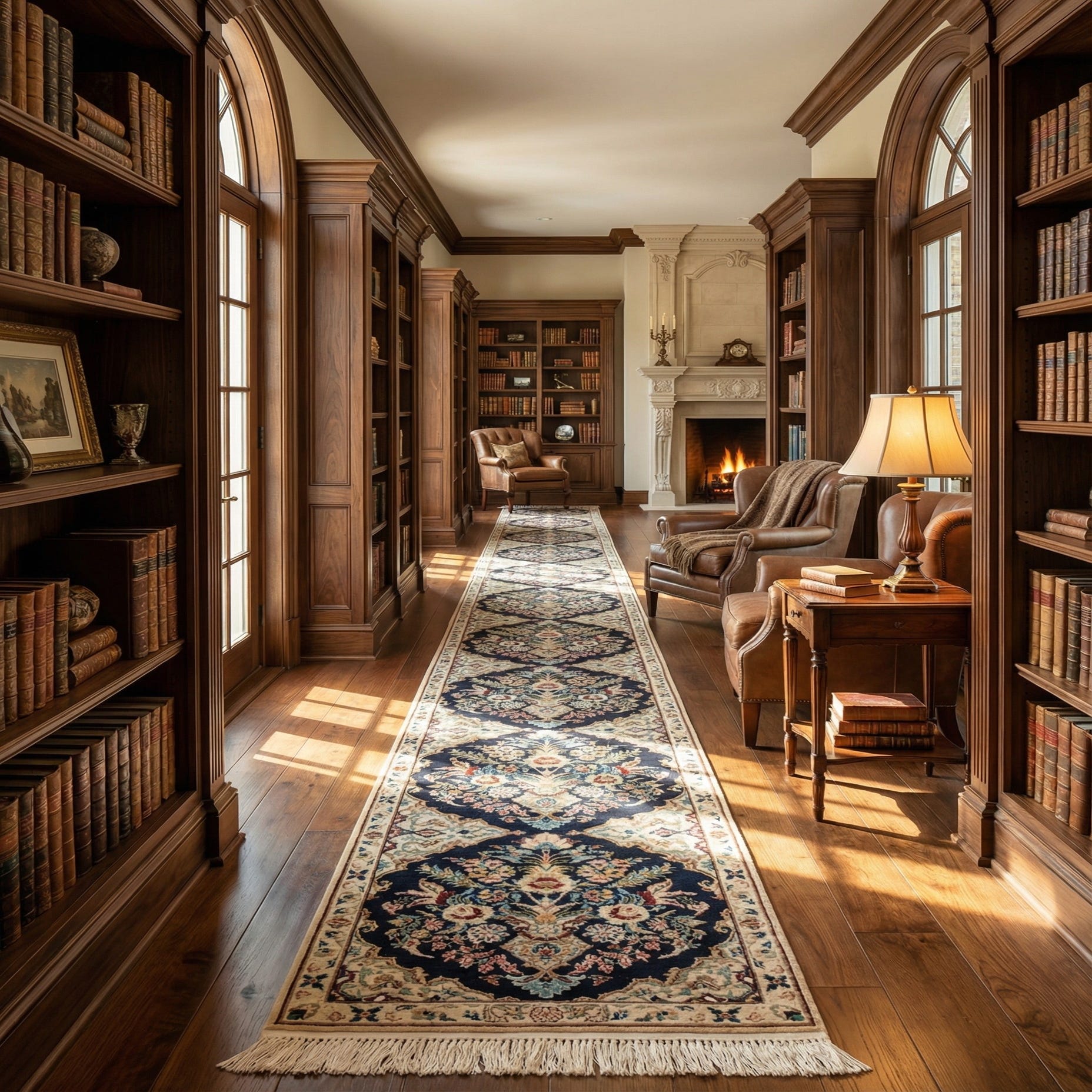 Primary color is Dark Blue. Colors in this rug include: Dark Blue, Runner.