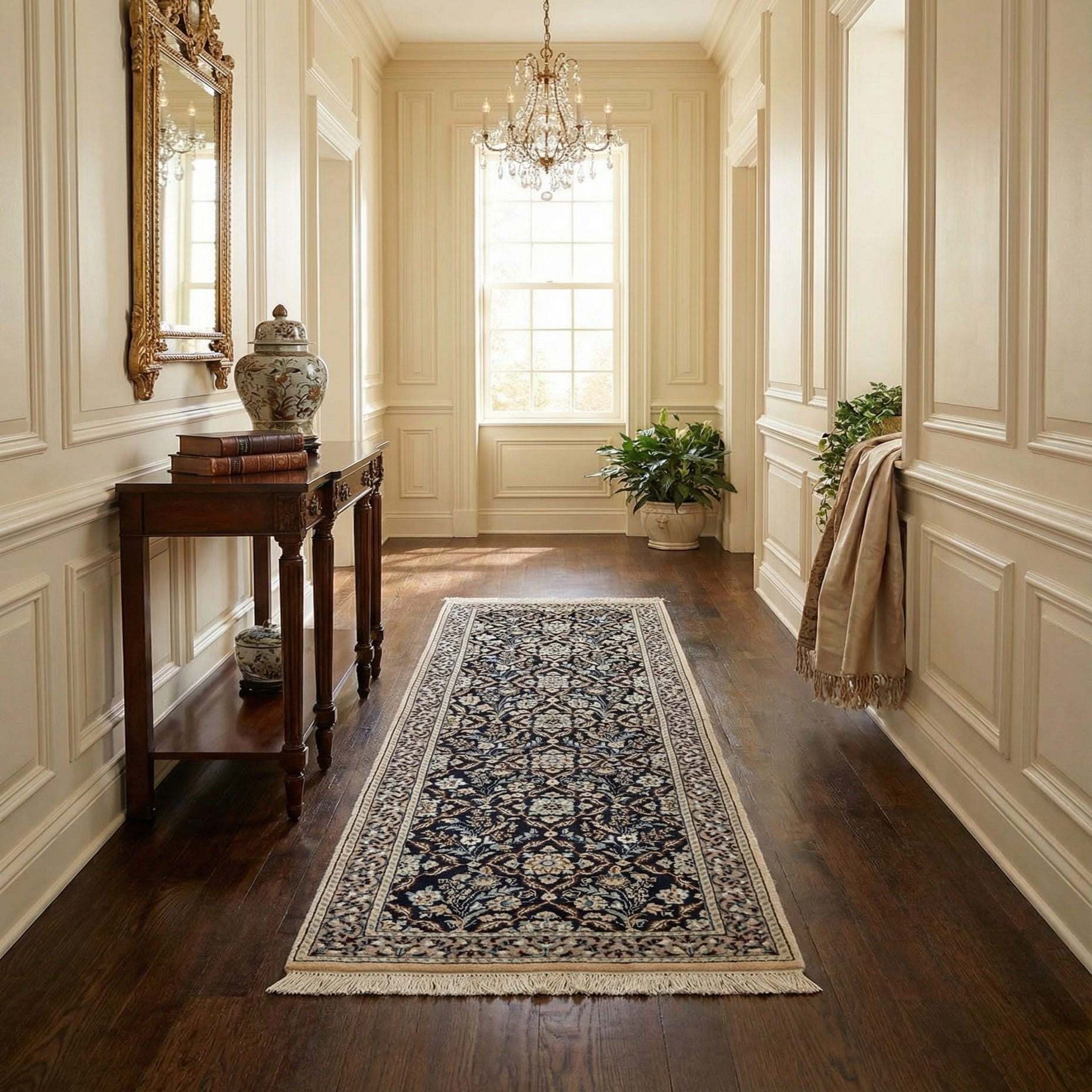 Primary color is Dark Blue. Colors in this rug include: Dark Blue, Runner.