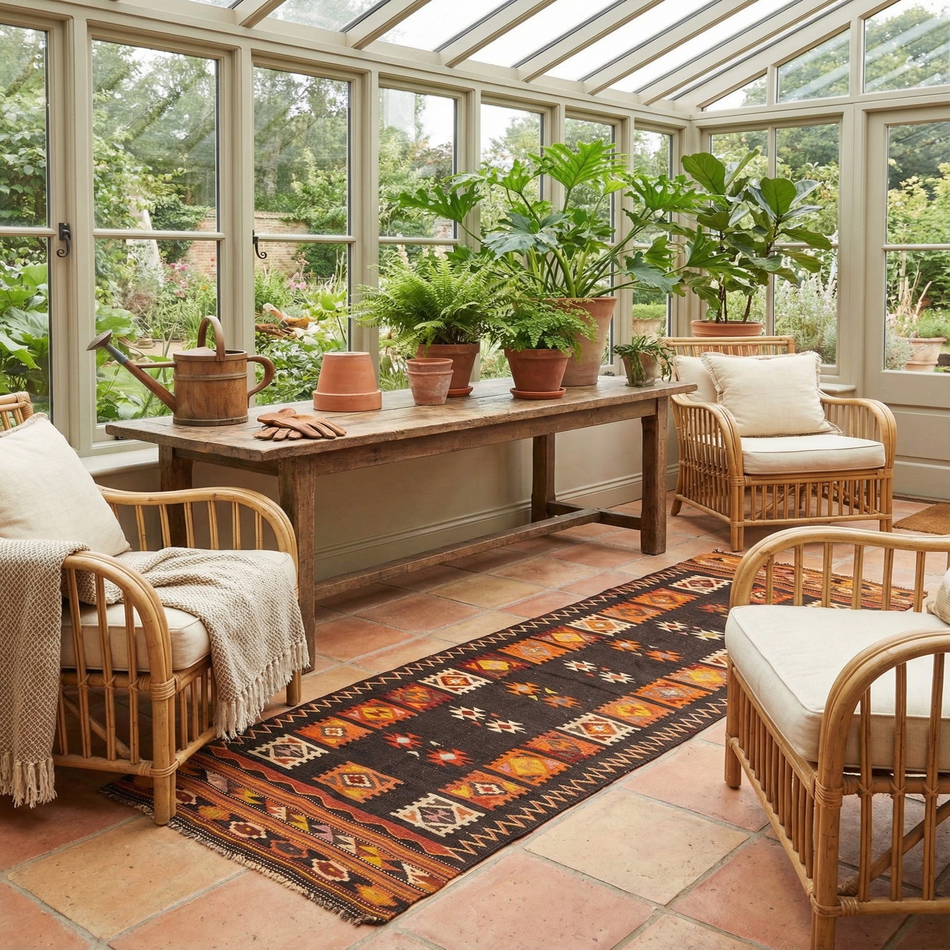 Primary color is Dark Brown. Colors in this rug include: Dark Brown, Ivory, Orange, Rust Red, Yellow, Light Brown.