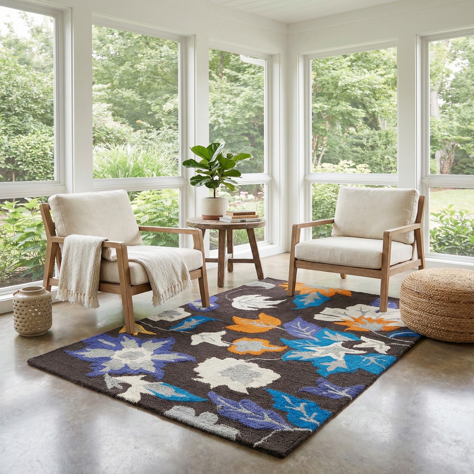 Primary color is Dark Brown. Colors in this rug include: Dark Brown, Blue, Ivory, Orange, Violet, Gray.