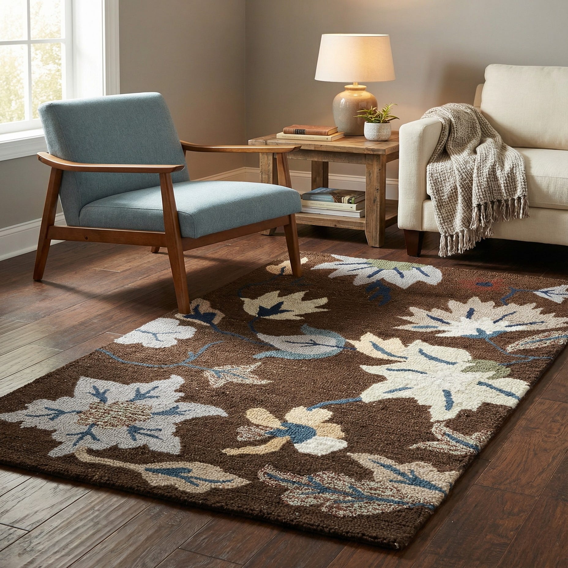 Primary color is Dark Brown. Colors in this rug include: Dark Brown, Gray, Ivory, Navy Blue, Terracotta, Blue.