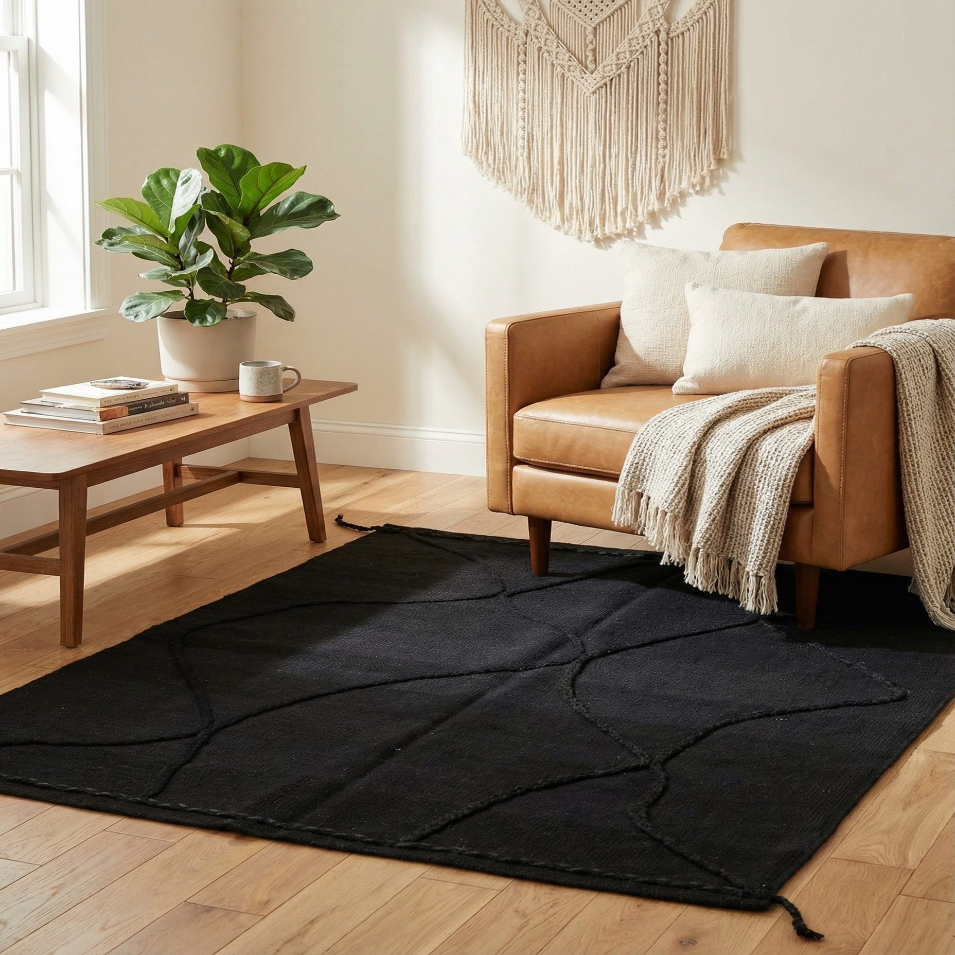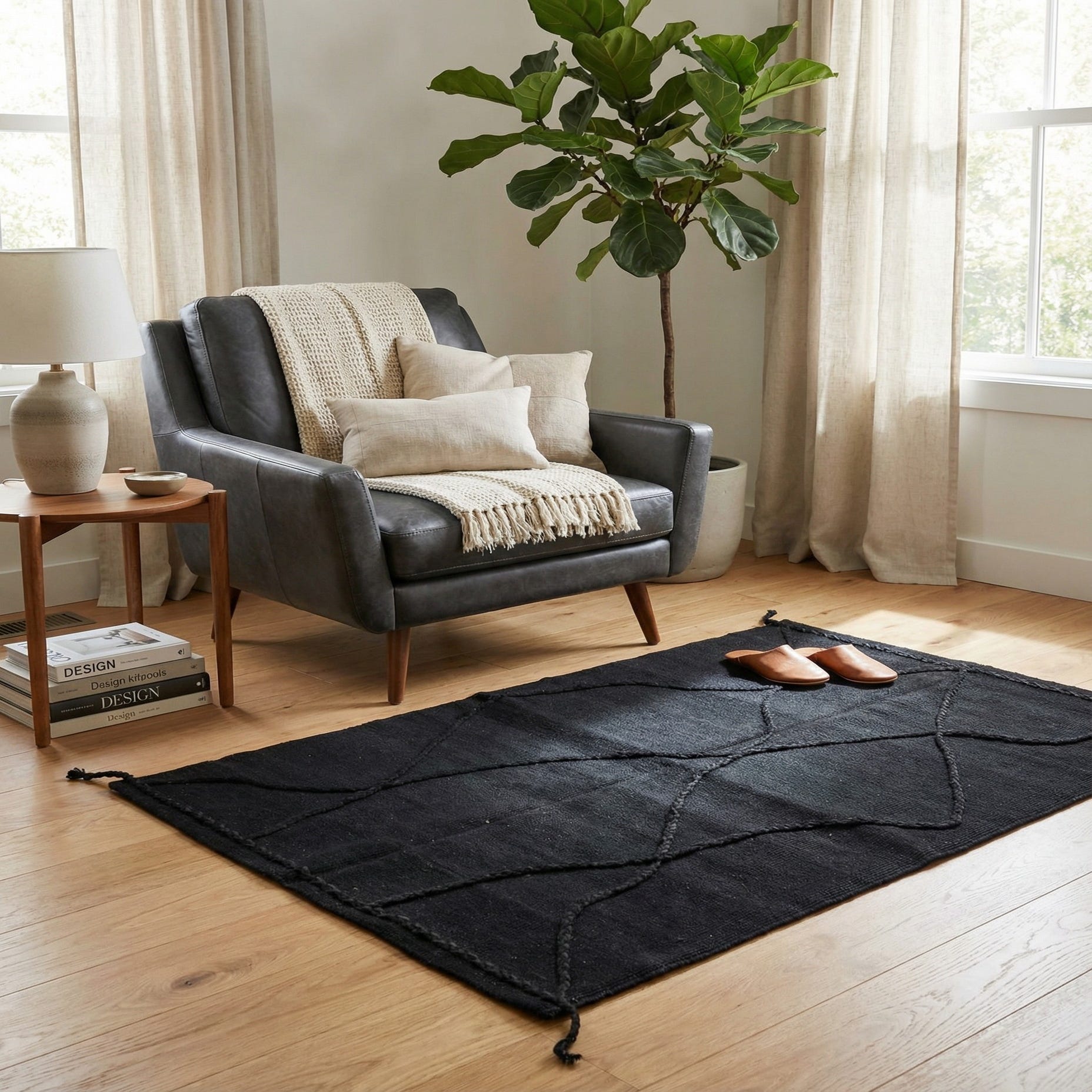 Primary color is Dark Brown. Colors in this rug include: Dark Brown, Black.