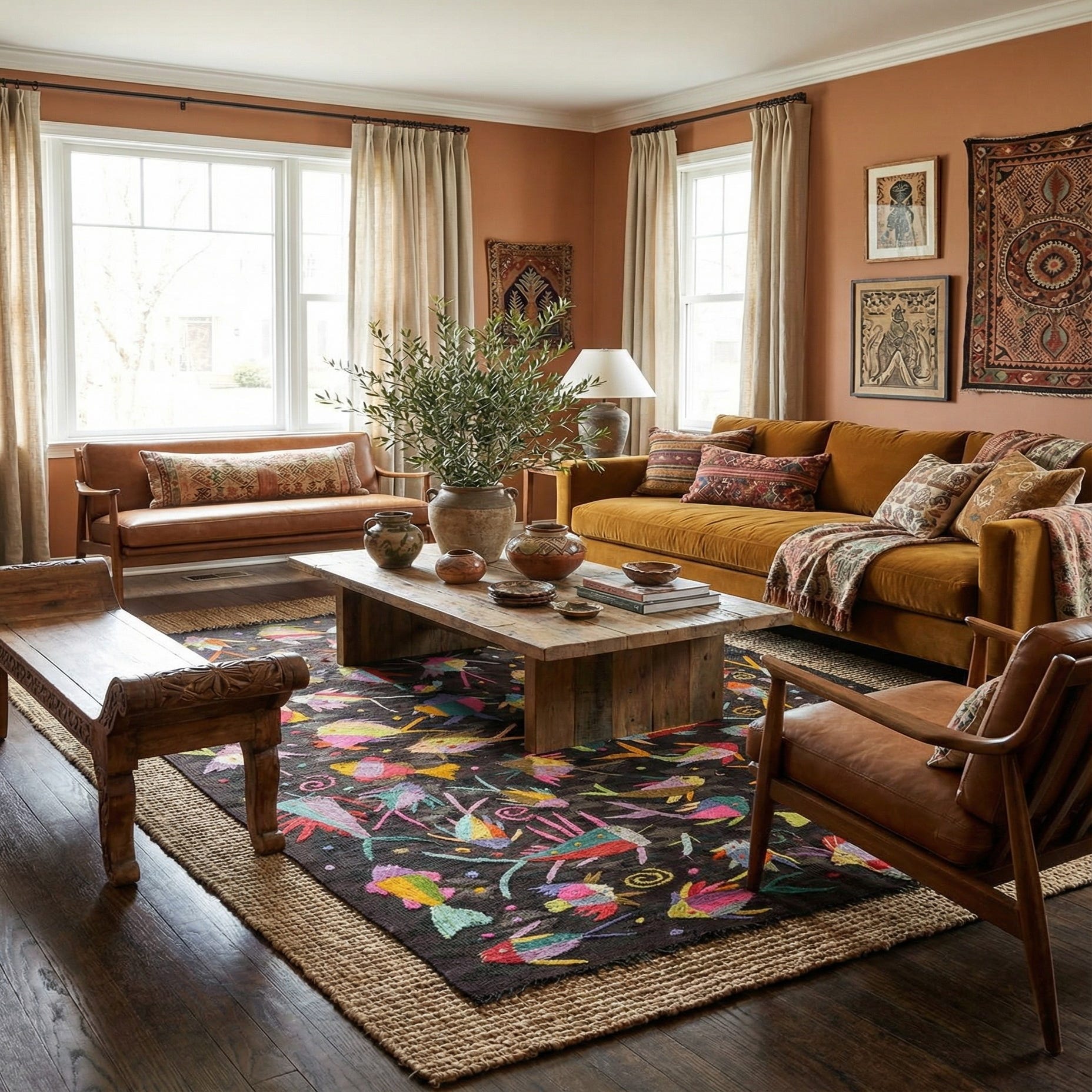 Primary color is Dark Brown. Colors in this rug include: Dark Brown, Blue, Brown, Gray, Olive, Orange, Red, Yellow, Purple, Pink.