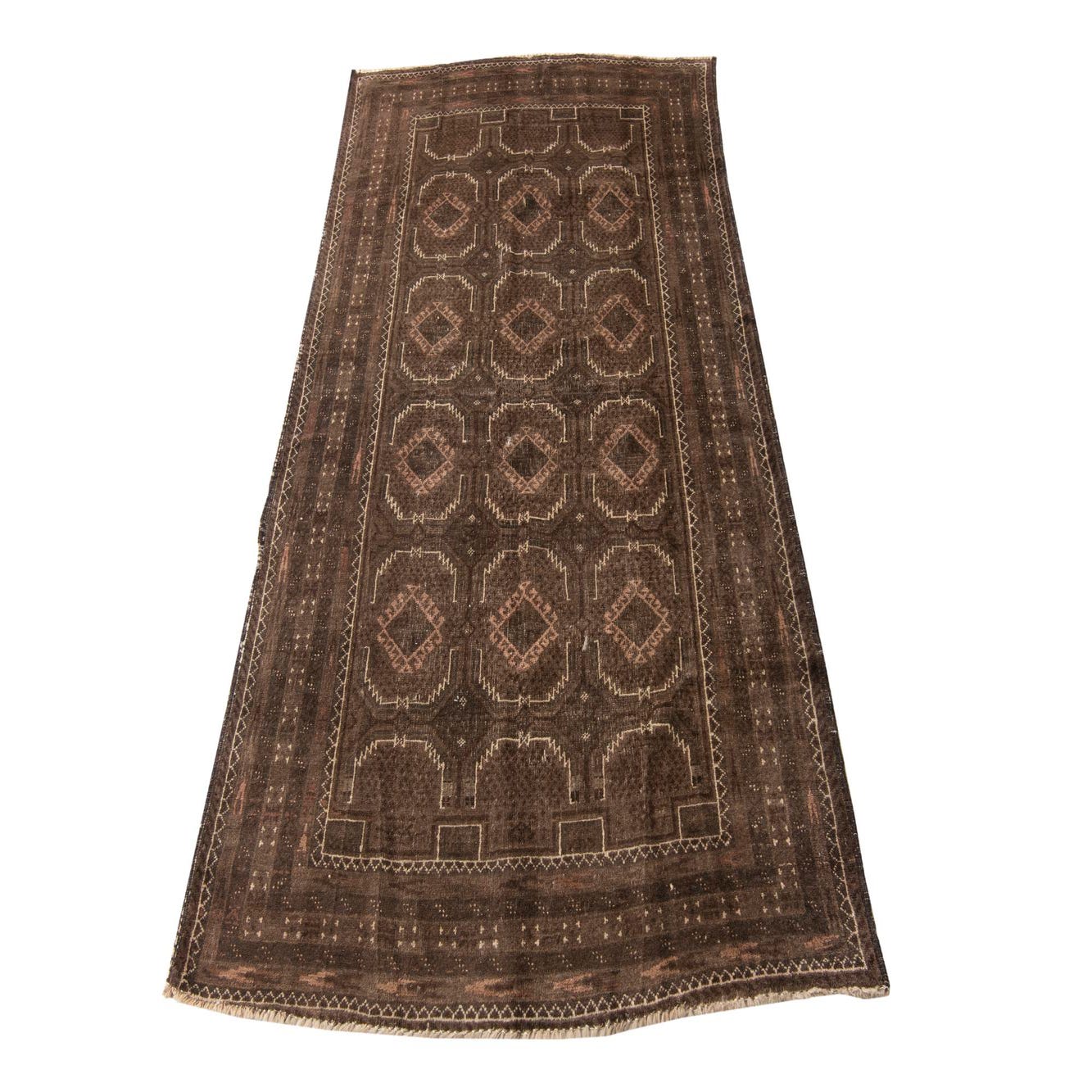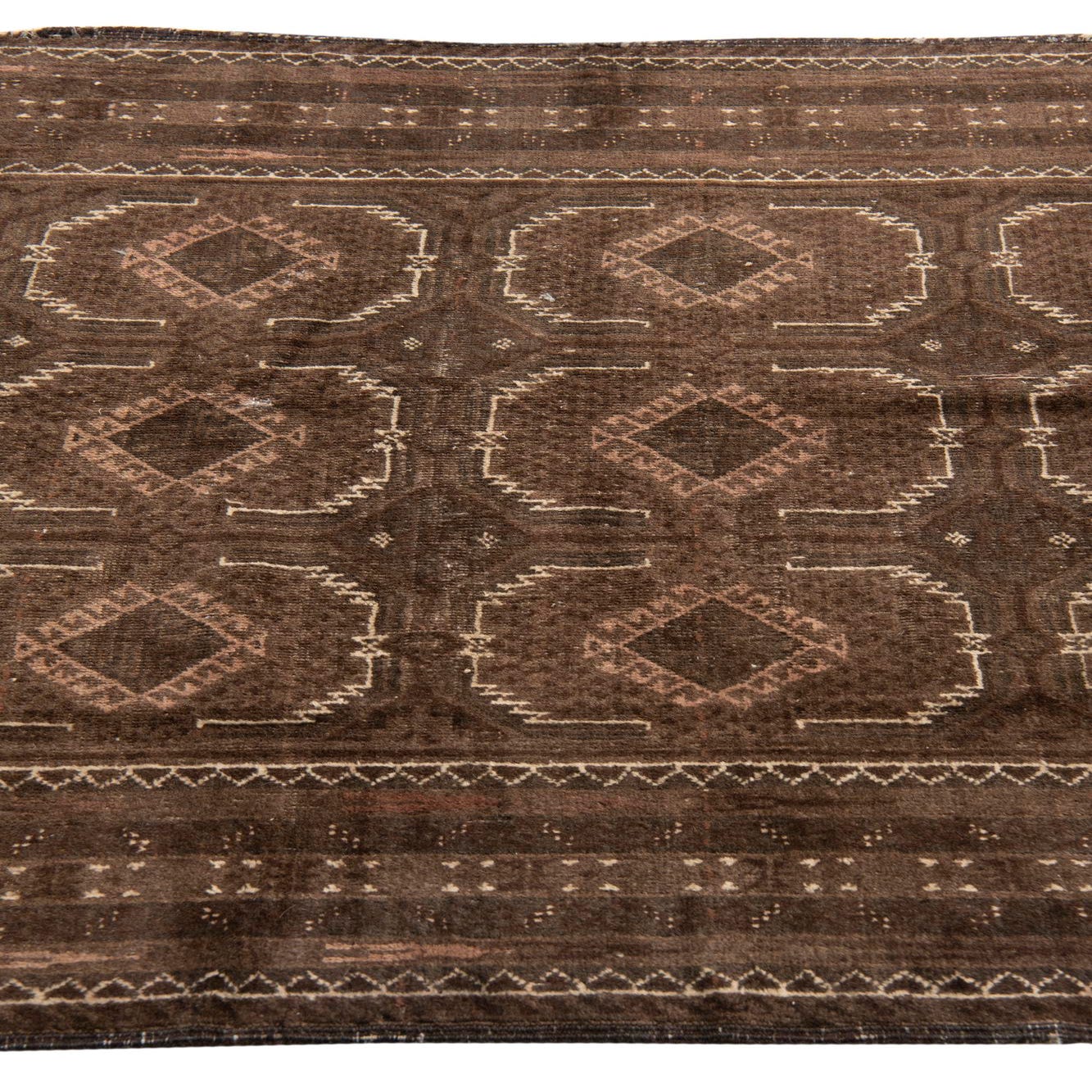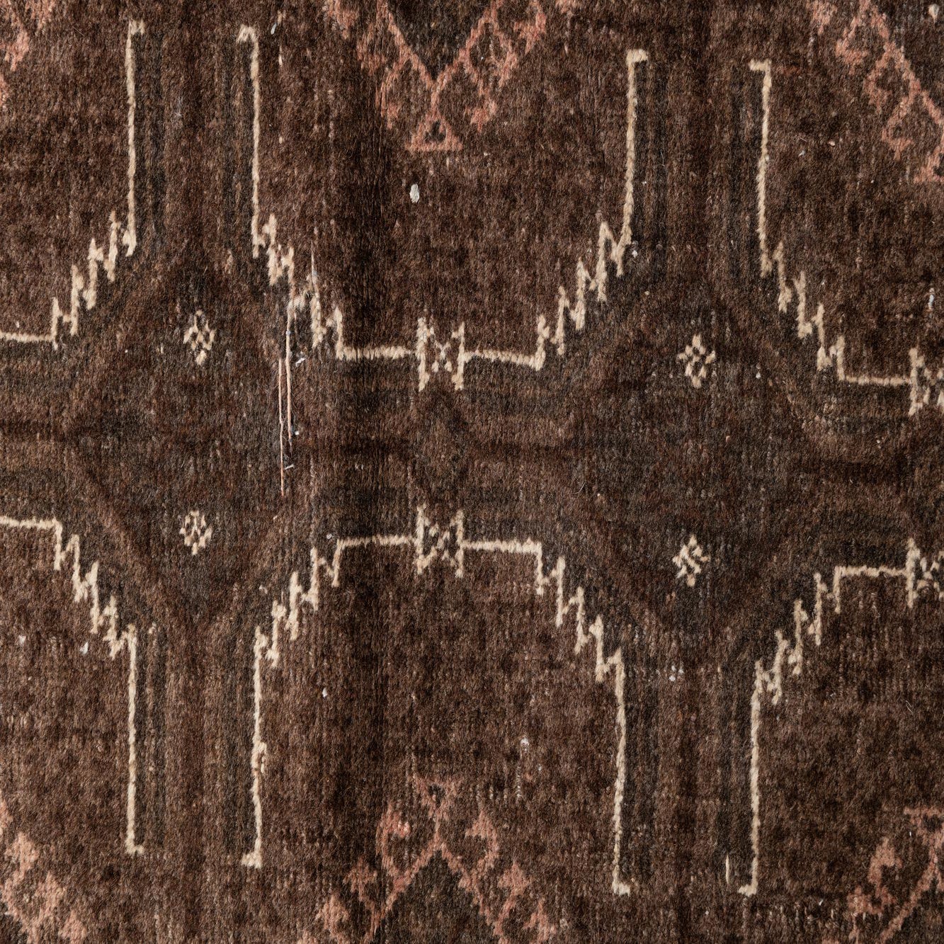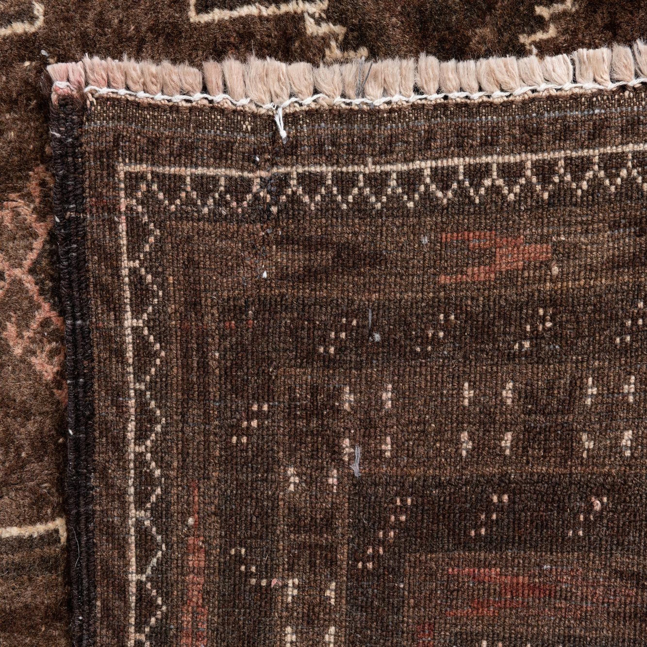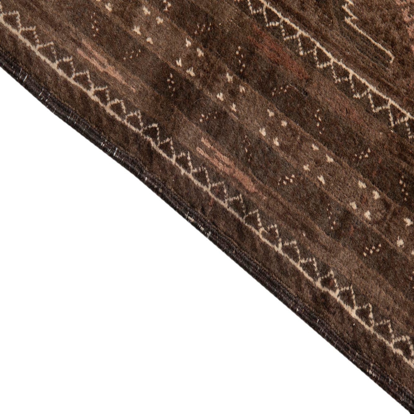 Primary color is Dark Brown. Colors in this rug include: Dark Brown, Brown, Ivory, Rust Red.