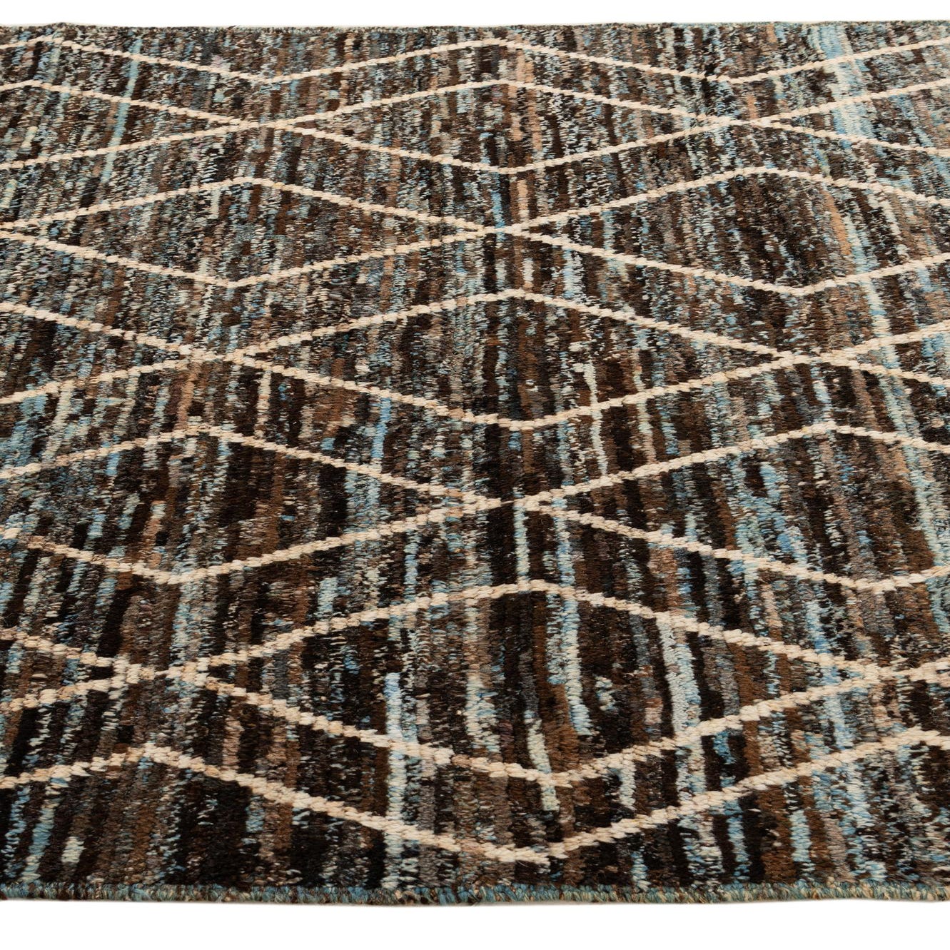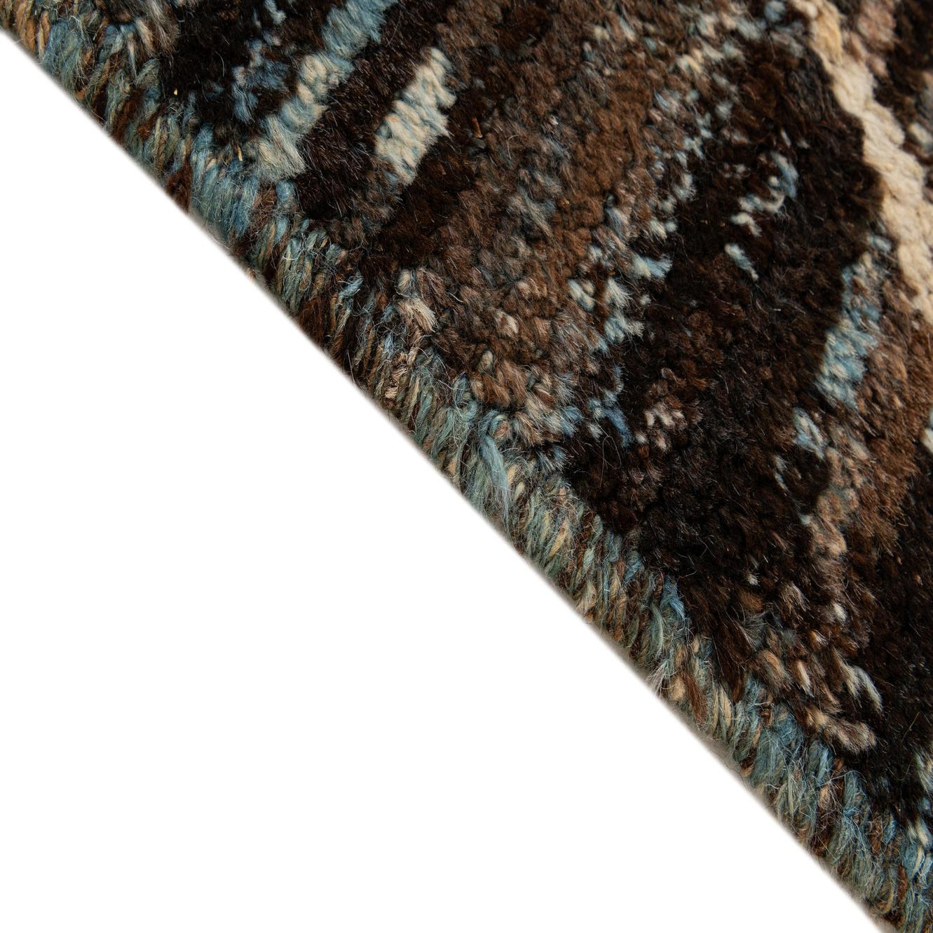 Primary color is Dark Brown. Colors in this rug include: Dark Brown, Blue, Brown, Ivory.
