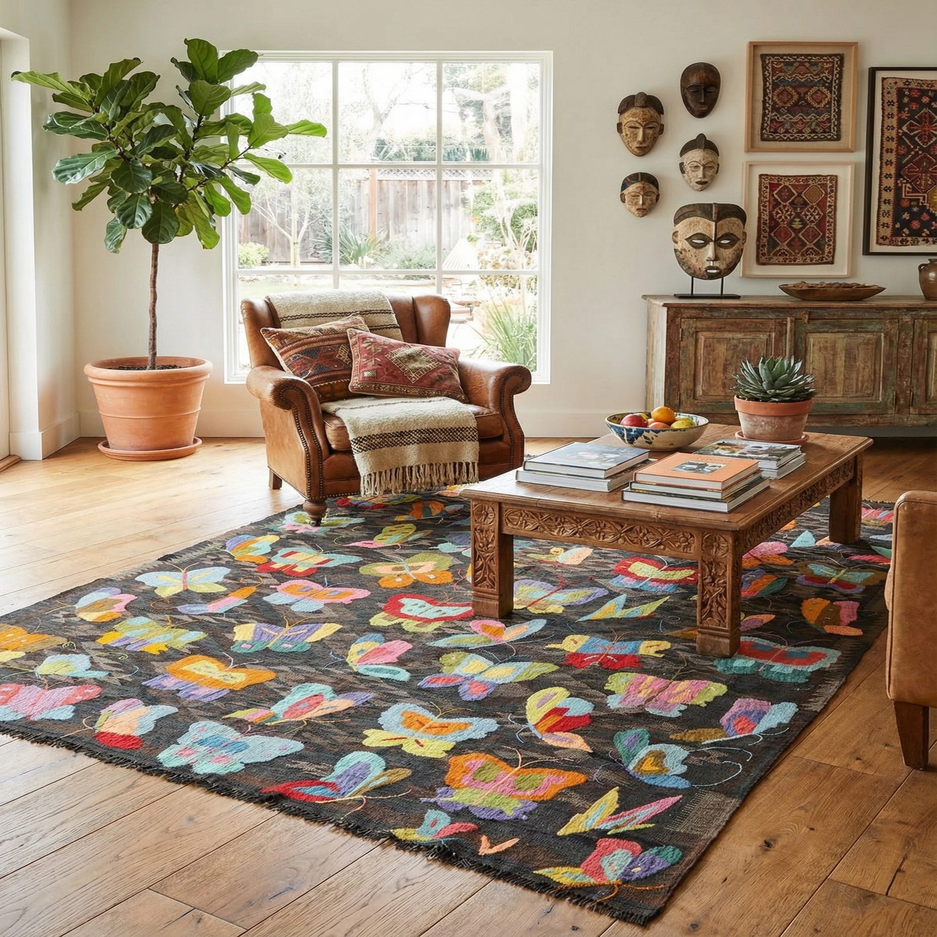 Primary color is Dark Brown. Colors in this rug include: Dark Brown, Light Blue, Light Green, Orange, Red, Yellow, Violet, Pink, Olive.