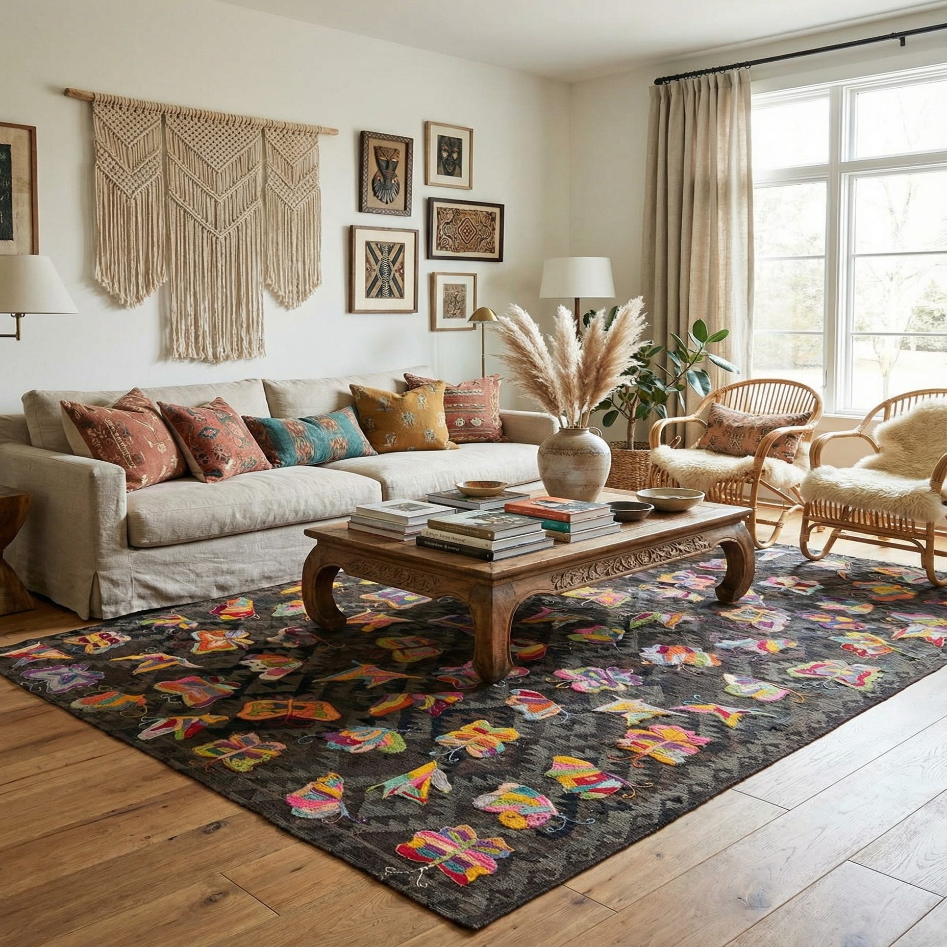 Primary color is Dark Brown. Colors in this rug include: Dark Brown, Blue, Brown, Green, Light Green, Orange, Red, Violet, Purple, Pink.