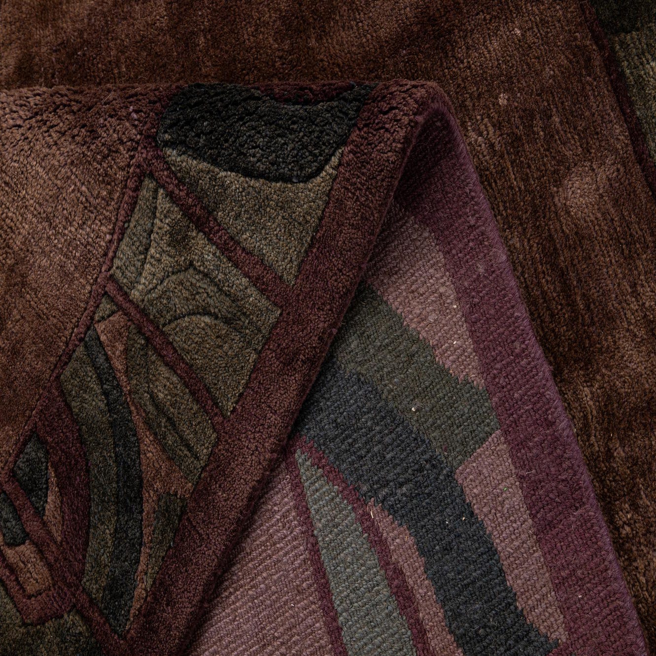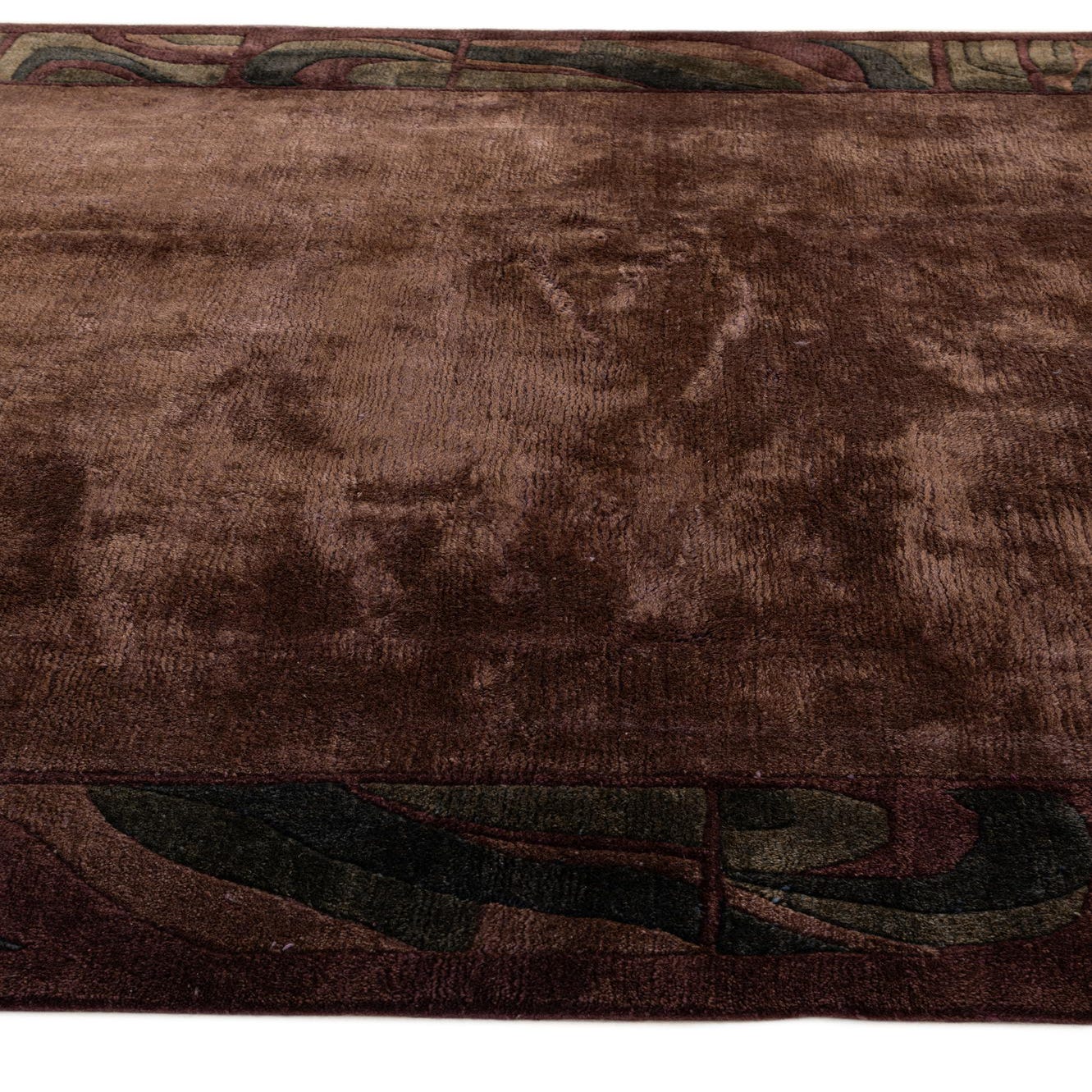Primary color is Dark Brown. Colors in this rug include: Dark Brown, Navy Blue, Gold, Green.