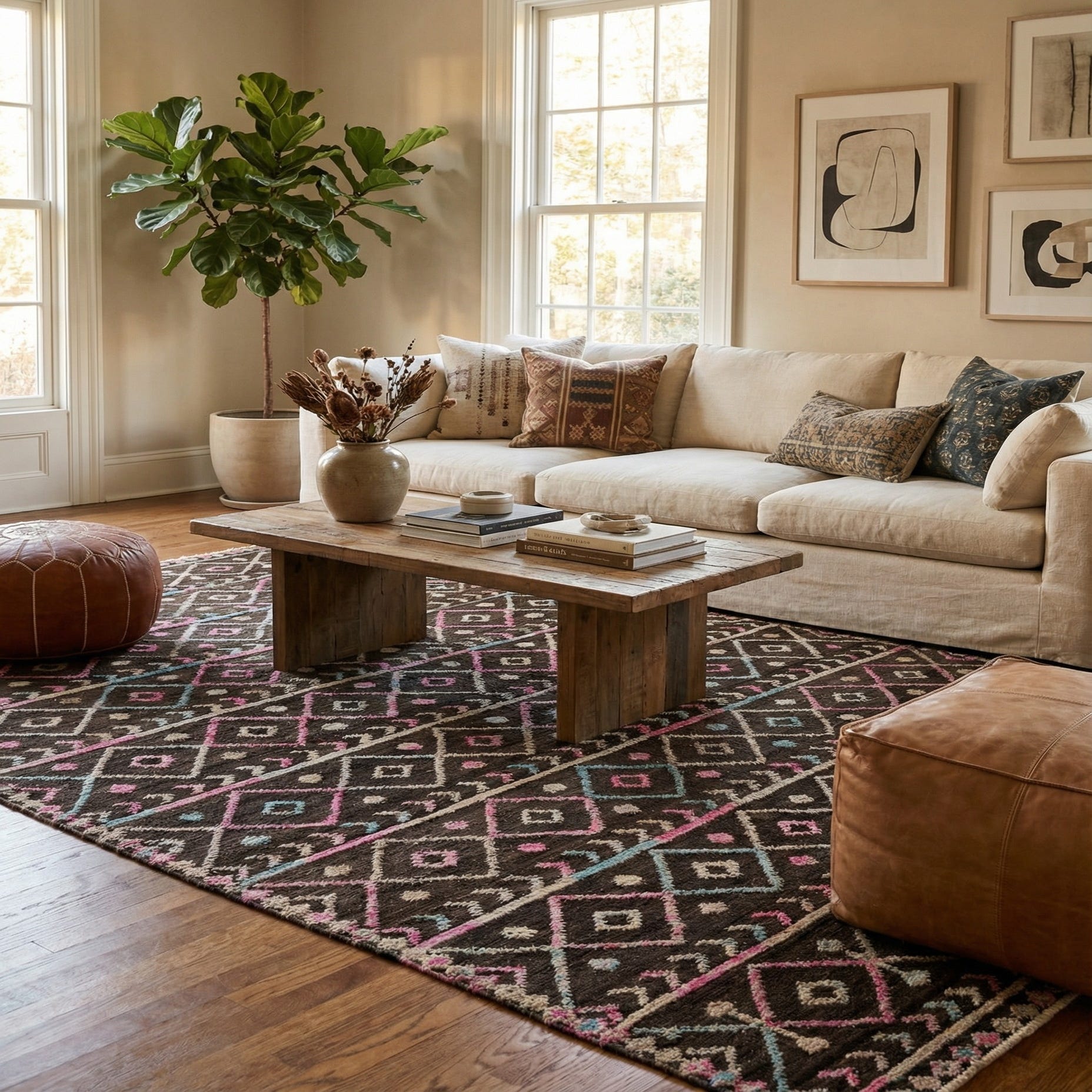 Primary color is Dark Brown. Colors in this rug include: Dark Brown, Beige, Pink, Blue, Brown.