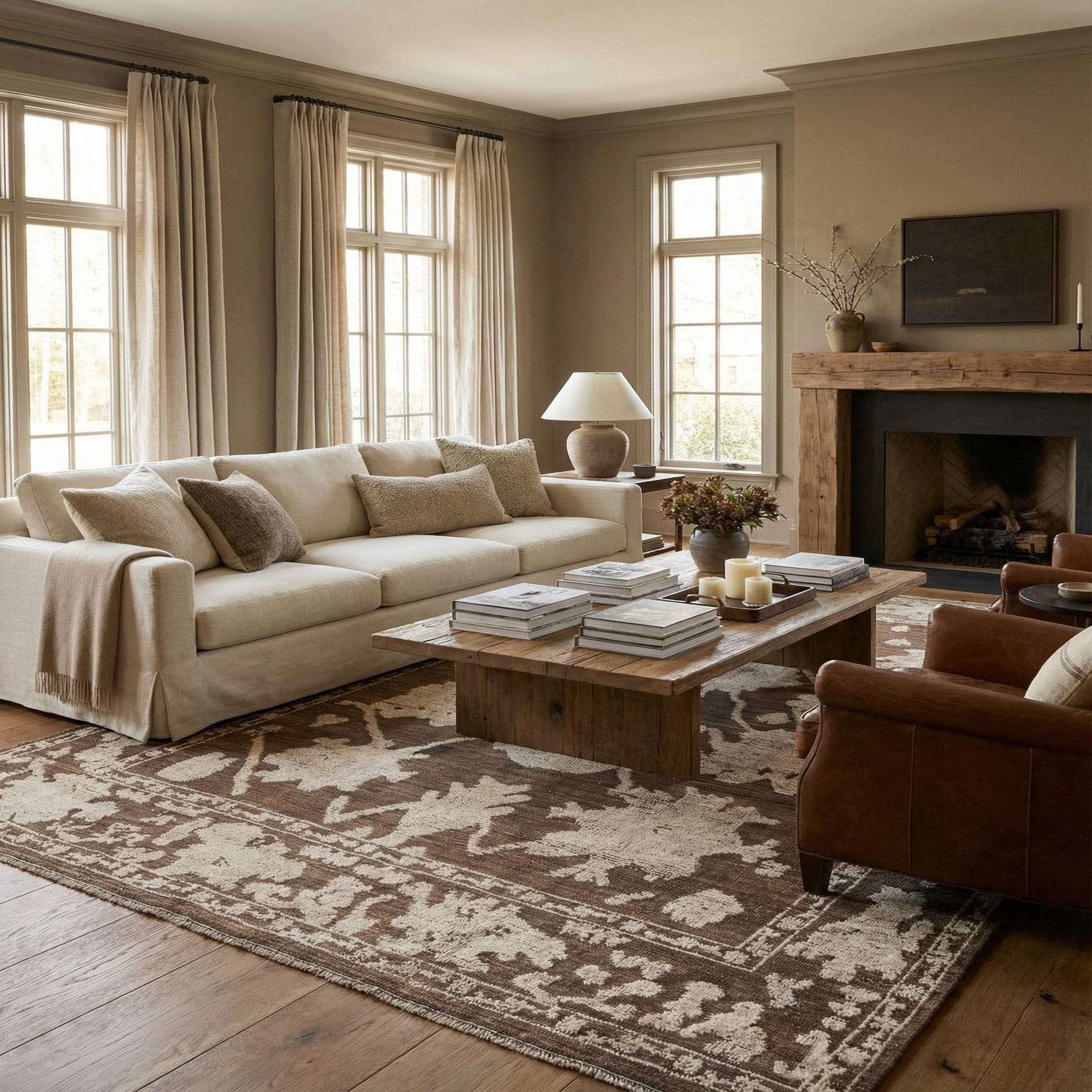 Primary color is Dark Brown. Colors in this rug include: Dark Brown, Ivory, Gray.