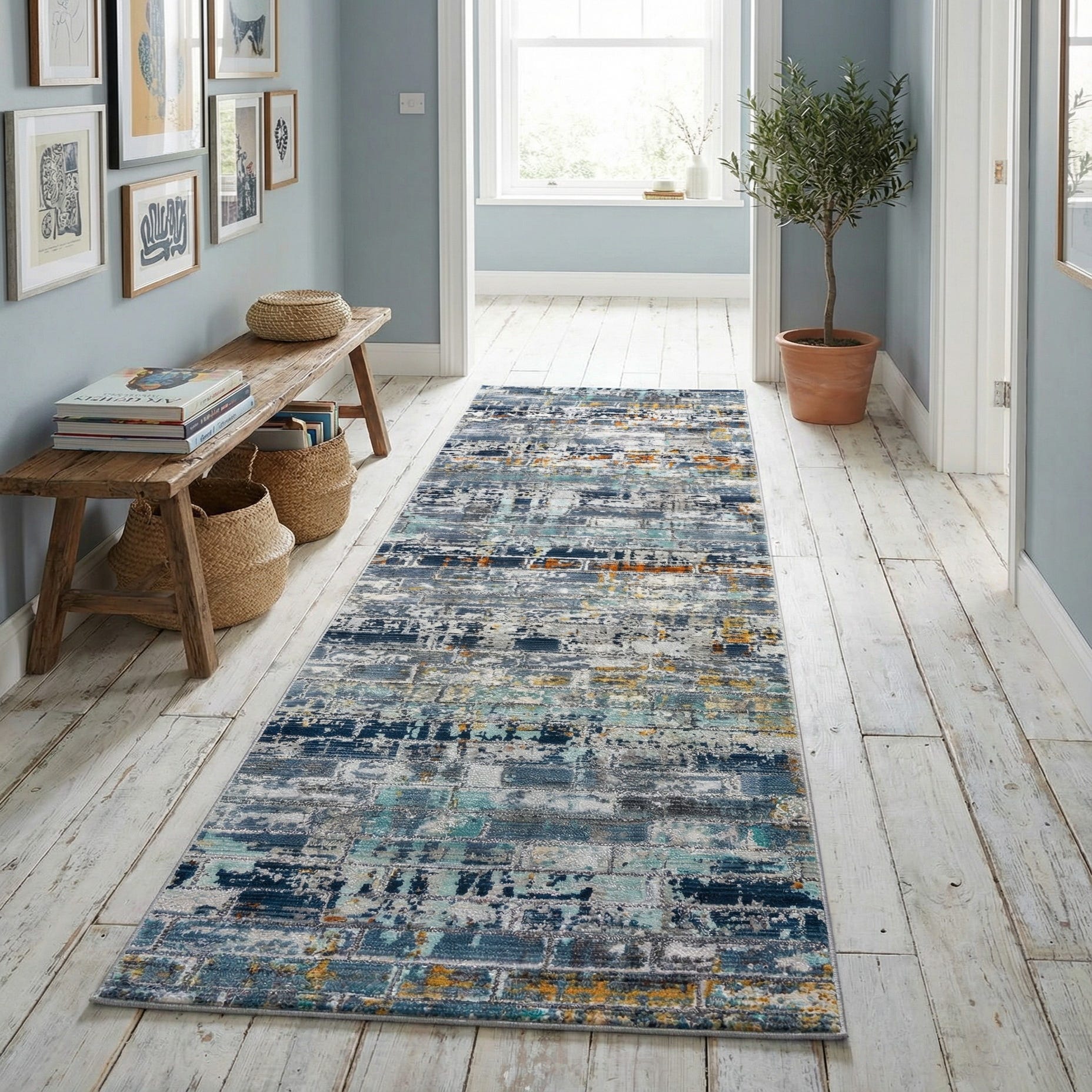 Primary color is Dark Gray. Colors in this rug include: Dark Gray, Gold, Gray, Ivory, Navy Blue, Teal, Terracotta, Light Blue.