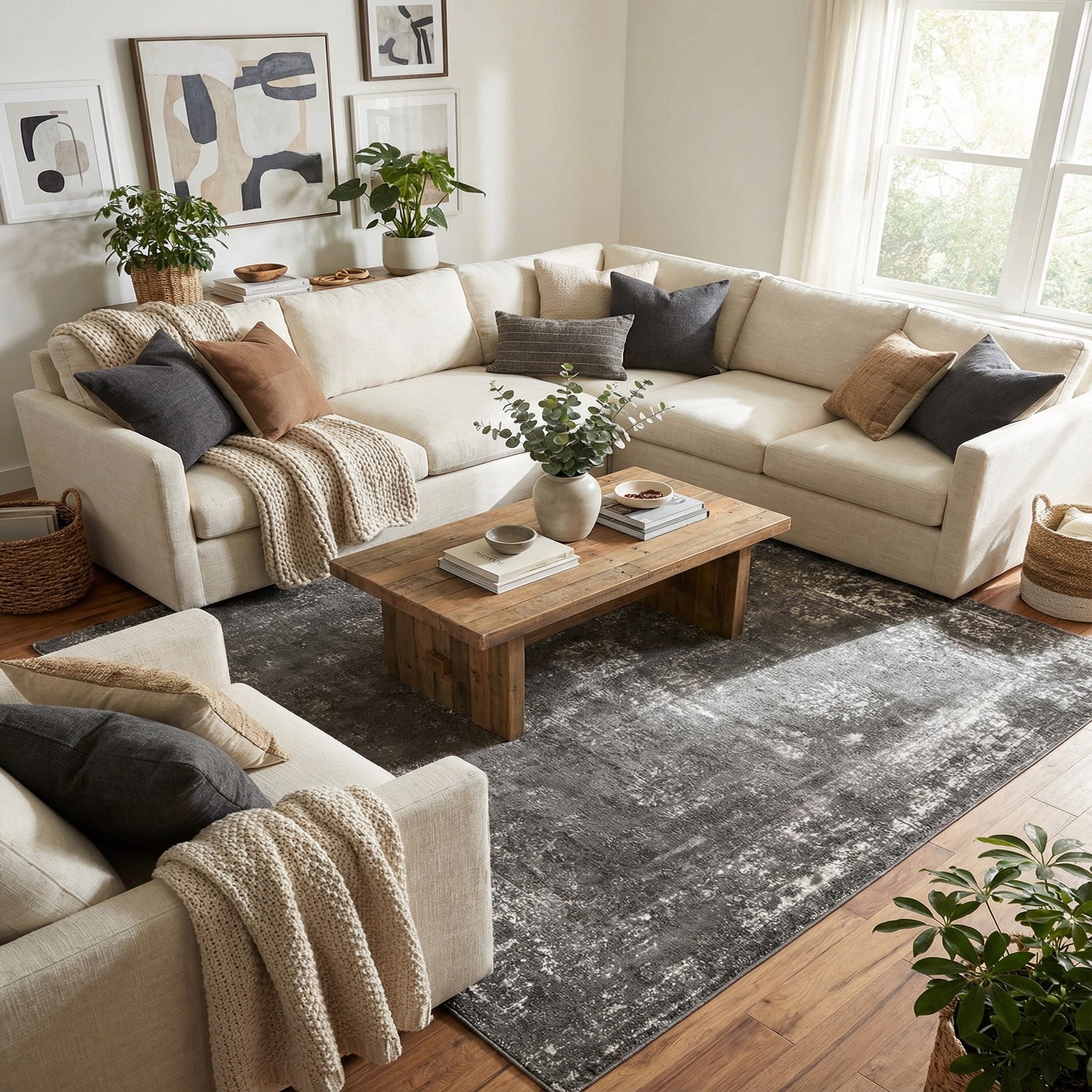 Primary color is Dark Gray. Colors in this rug include: Dark Gray, Beige.