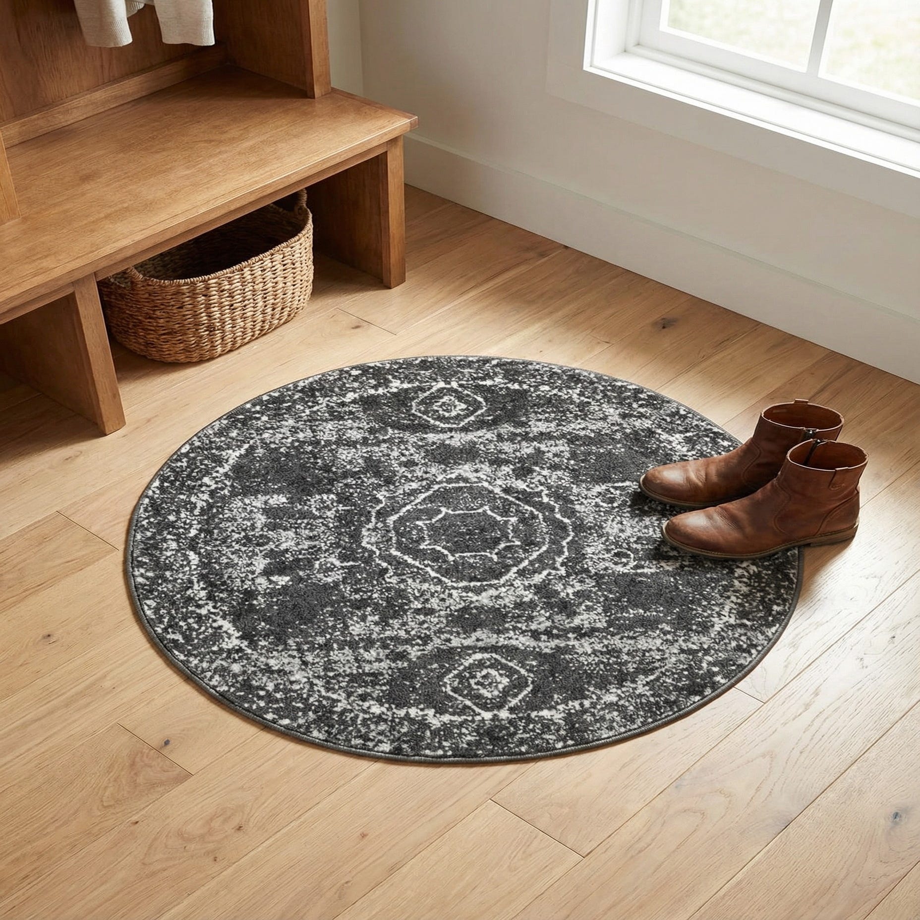 Primary color is Dark Gray. Colors in this rug include: Dark Gray, Gray, Ivory.