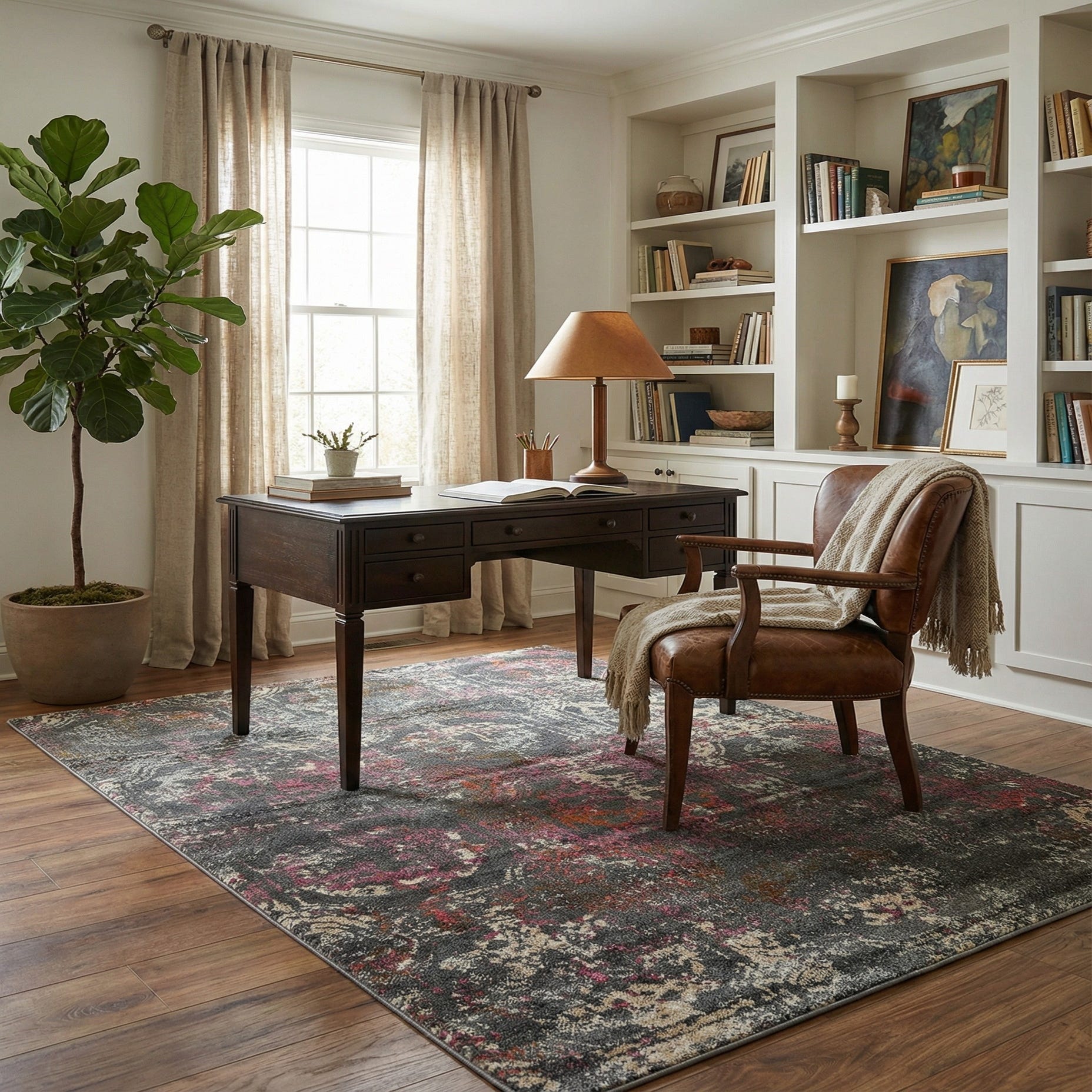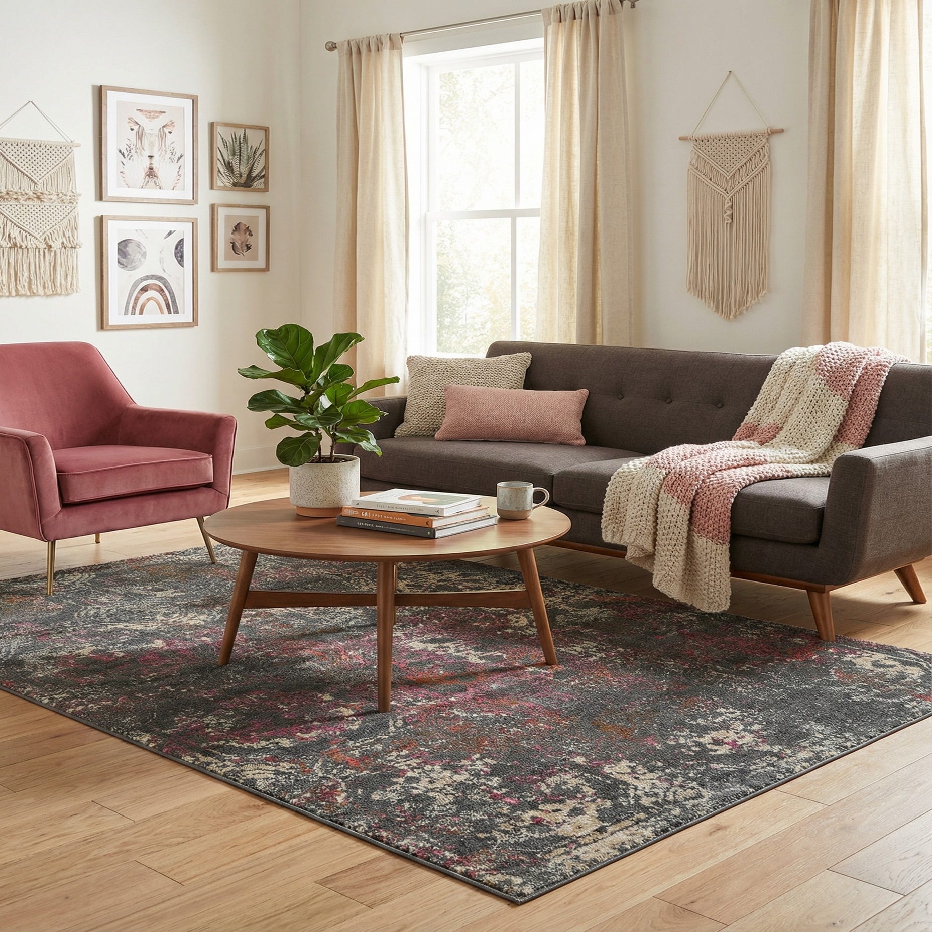 Primary color is Dark Gray. Colors in this rug include: Dark Gray, Beige, Black, Blue, Brown, Orange.
