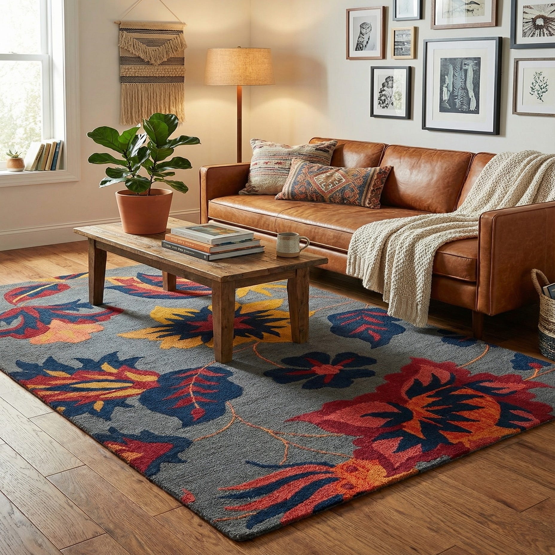 Primary color is Dark Gray. Colors in this rug include: Dark Gray, Navy Blue, Orange, Red, Gold.