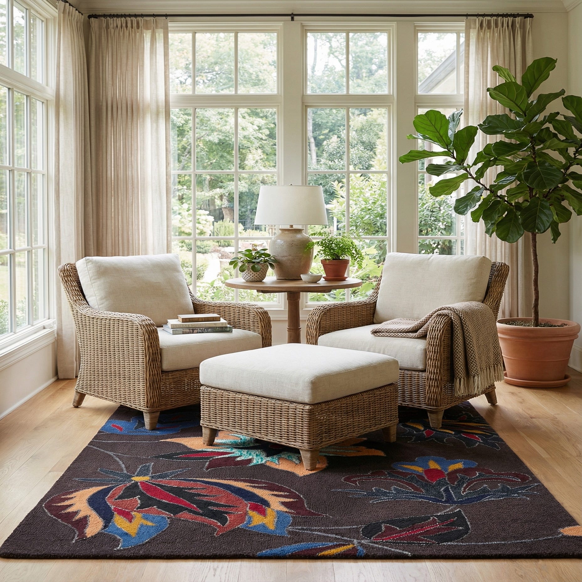 Primary color is Dark Gray. Colors in this rug include: Dark Gray, Black, Blue, Burgundy, Gold, Green, Ivory, Peach, Red.