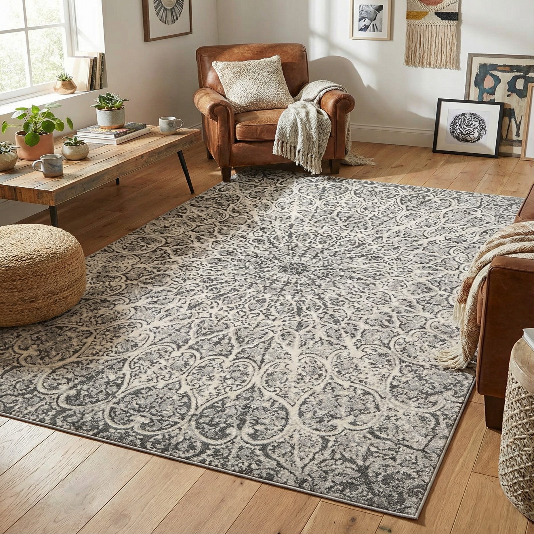 Primary color is Dark Gray. Colors in this rug include: Dark Gray, Gray, Ivory.