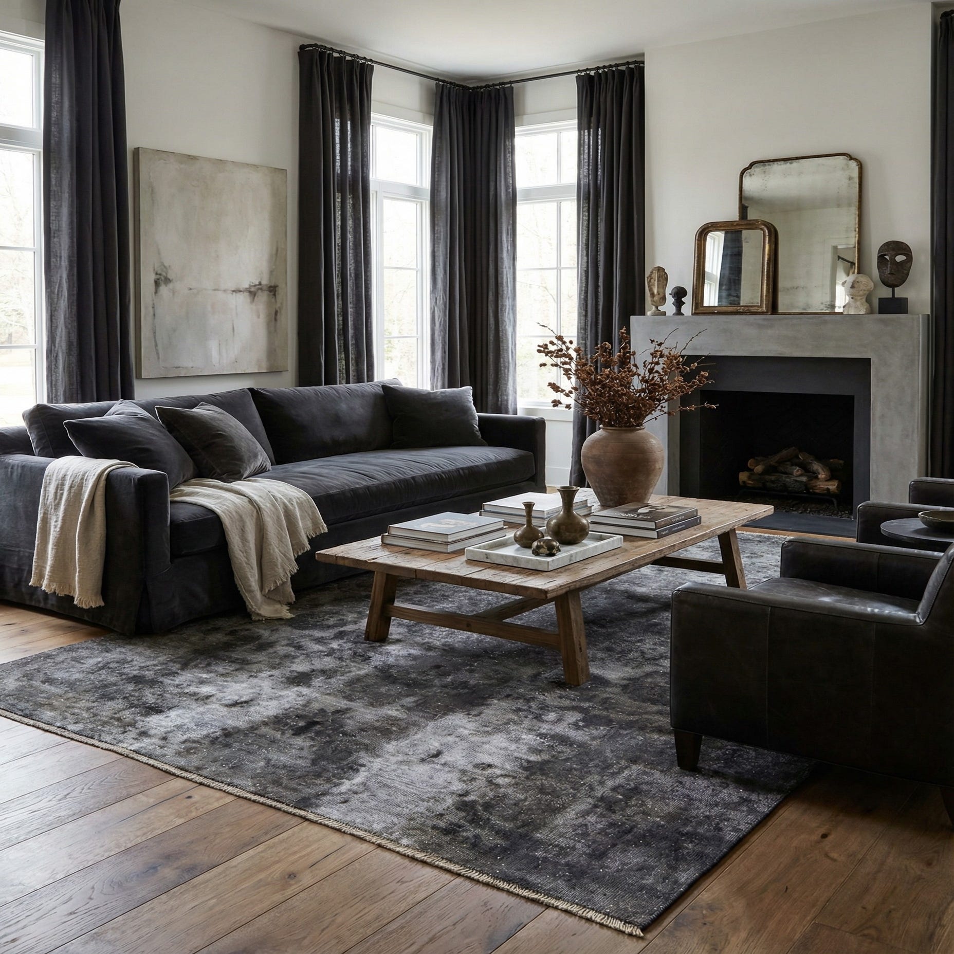 Primary color is Dark Gray. Colors in this rug include: Dark Gray, Ivory.