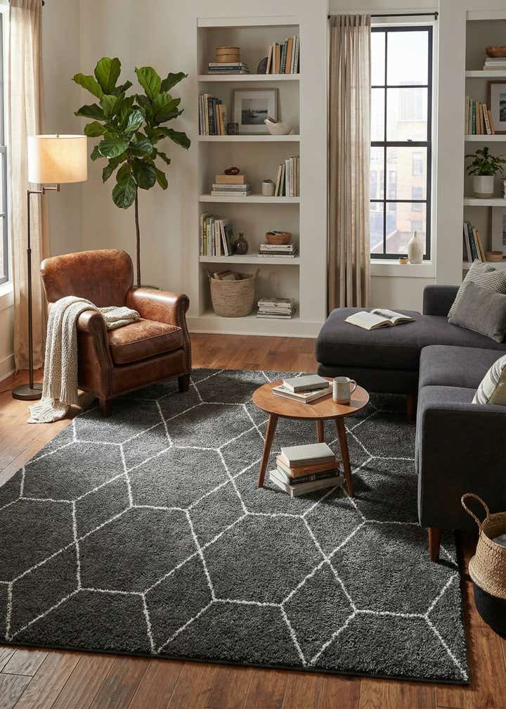 Primary color is Dark Gray. Colors in this rug include: Dark Gray, Ivory.