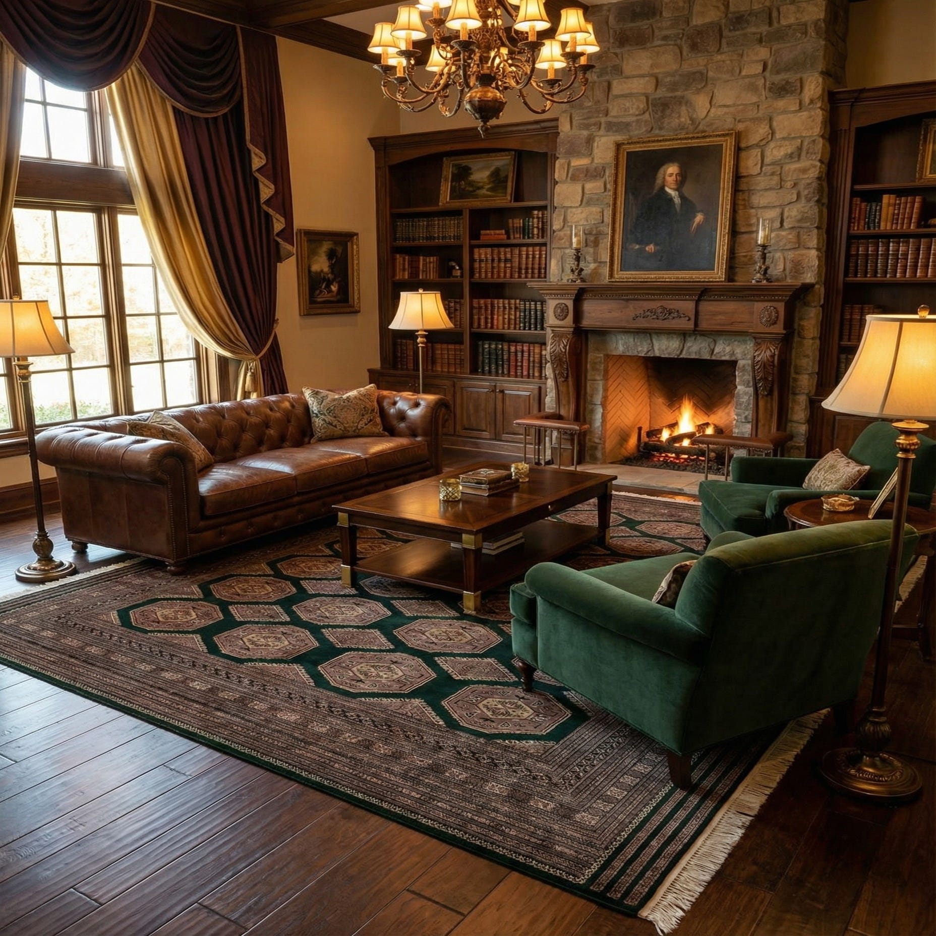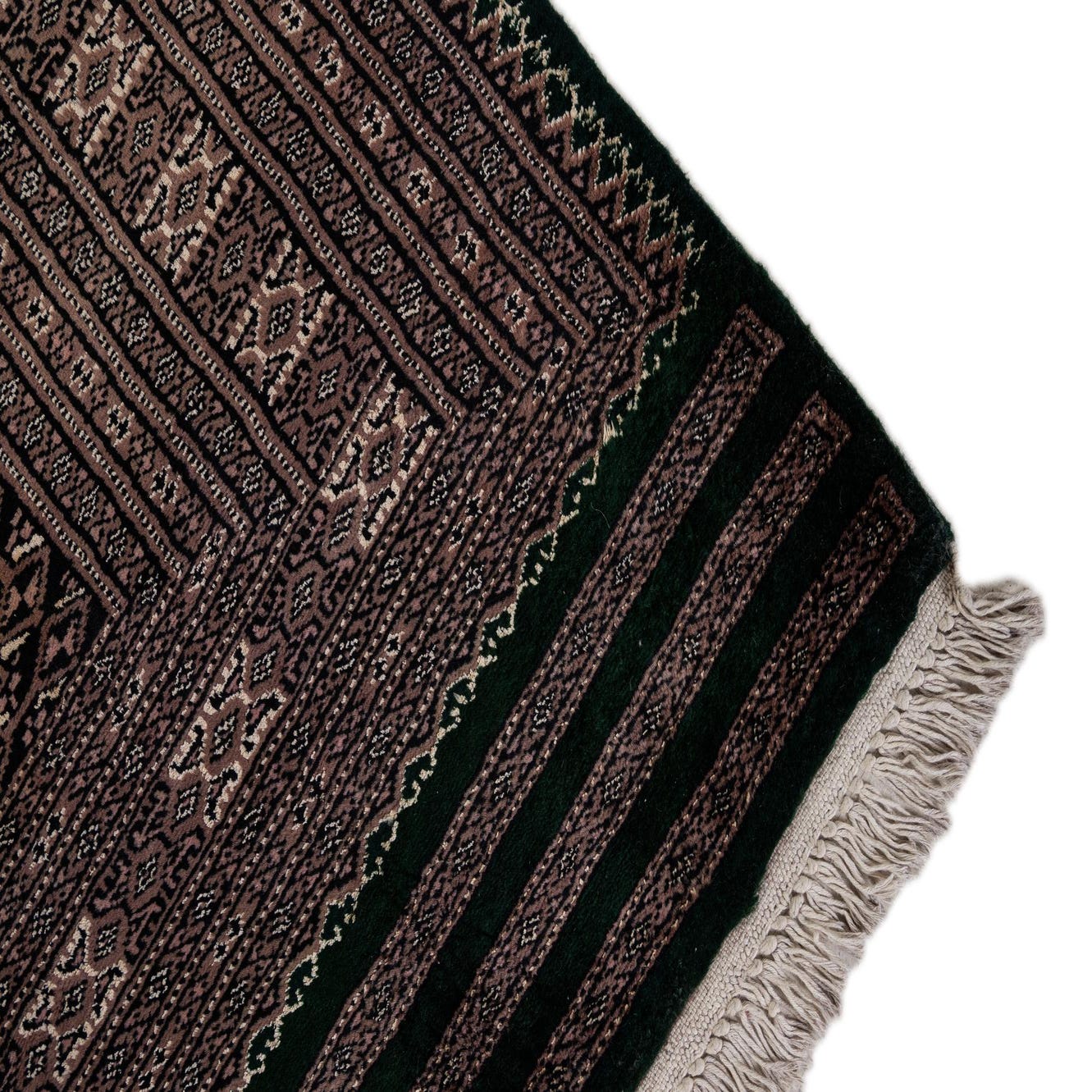 Primary color is Dark Green. Colors in this rug include: Dark Green, Black, Brown, Ivory, Pink.