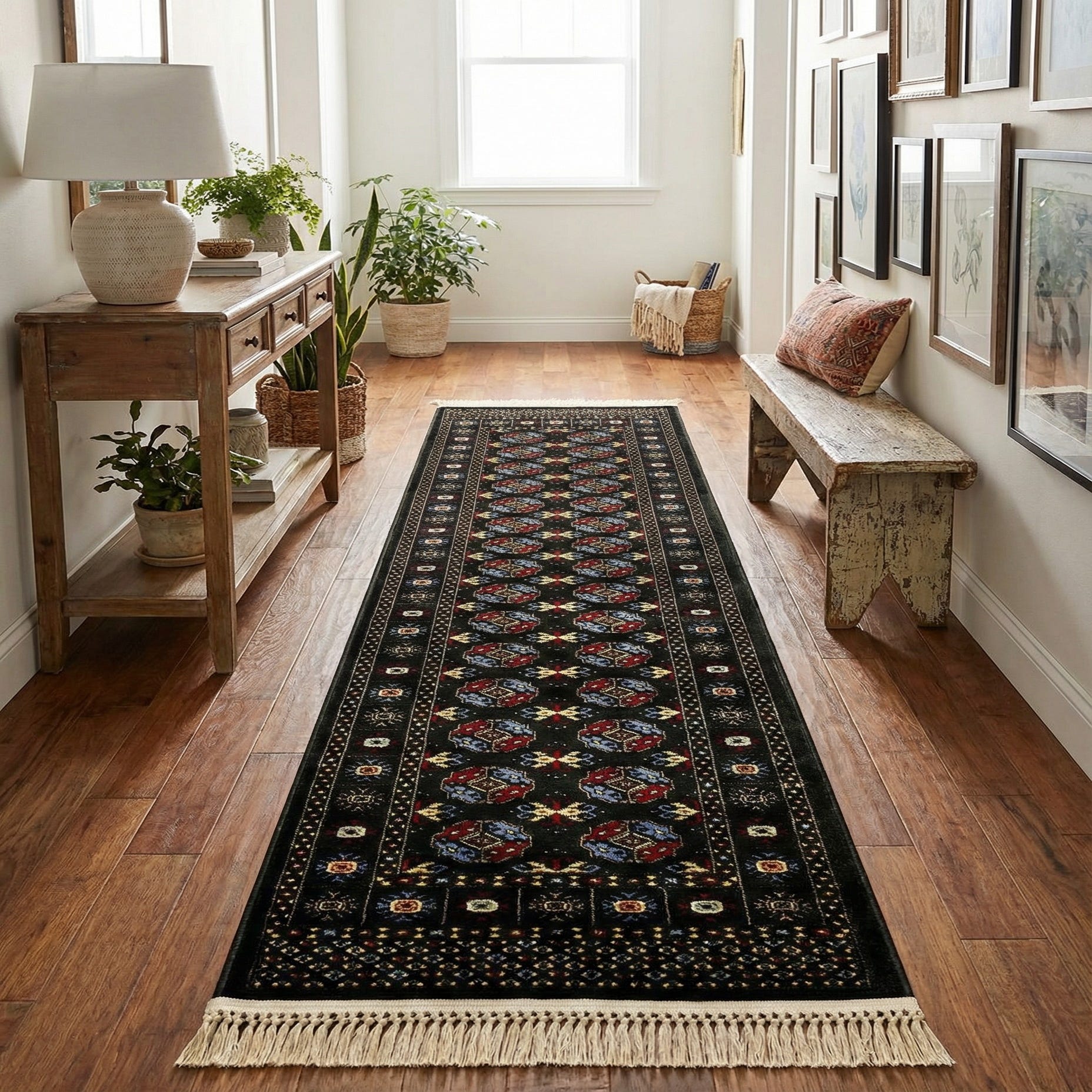 Primary color is Dark Green. Colors in this rug include: Dark Green, Beige, Black, Blue, Brown, Red, Ivory.