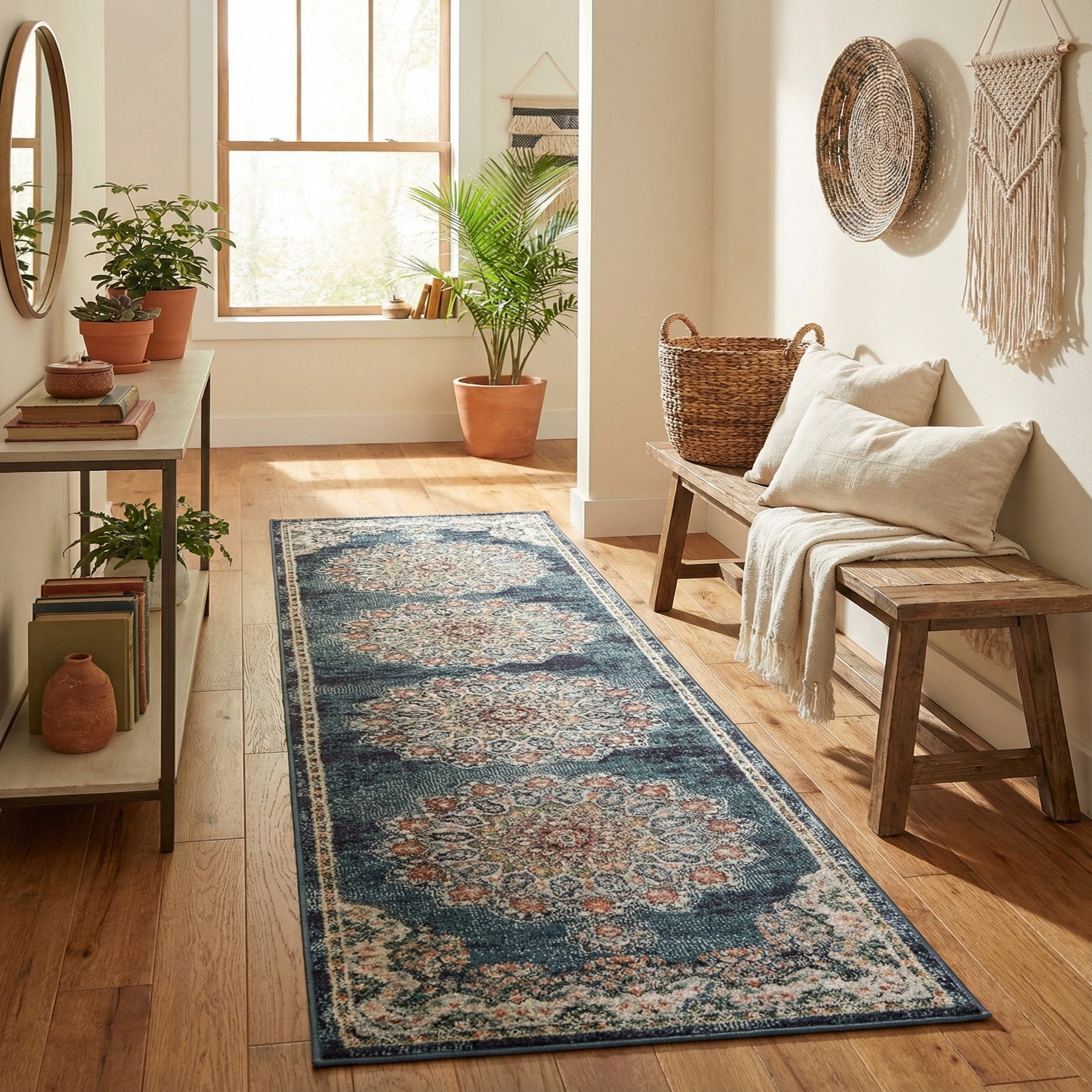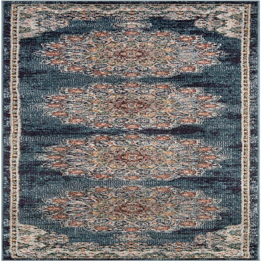 Primary color is Denim blue. Colors in this rug include: Denim blue, Beige, Green, Light Blue, Light Green, Navy Blue, Orange, Plum Red.