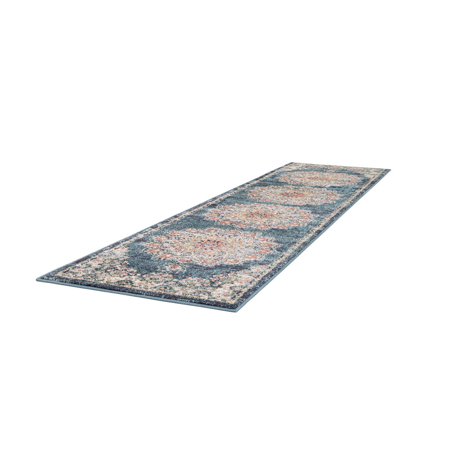 Primary color is Denim blue. Colors in this rug include: Denim blue, Beige, Green, Light Blue, Light Green, Orange, Navy Blue, Plum Red.