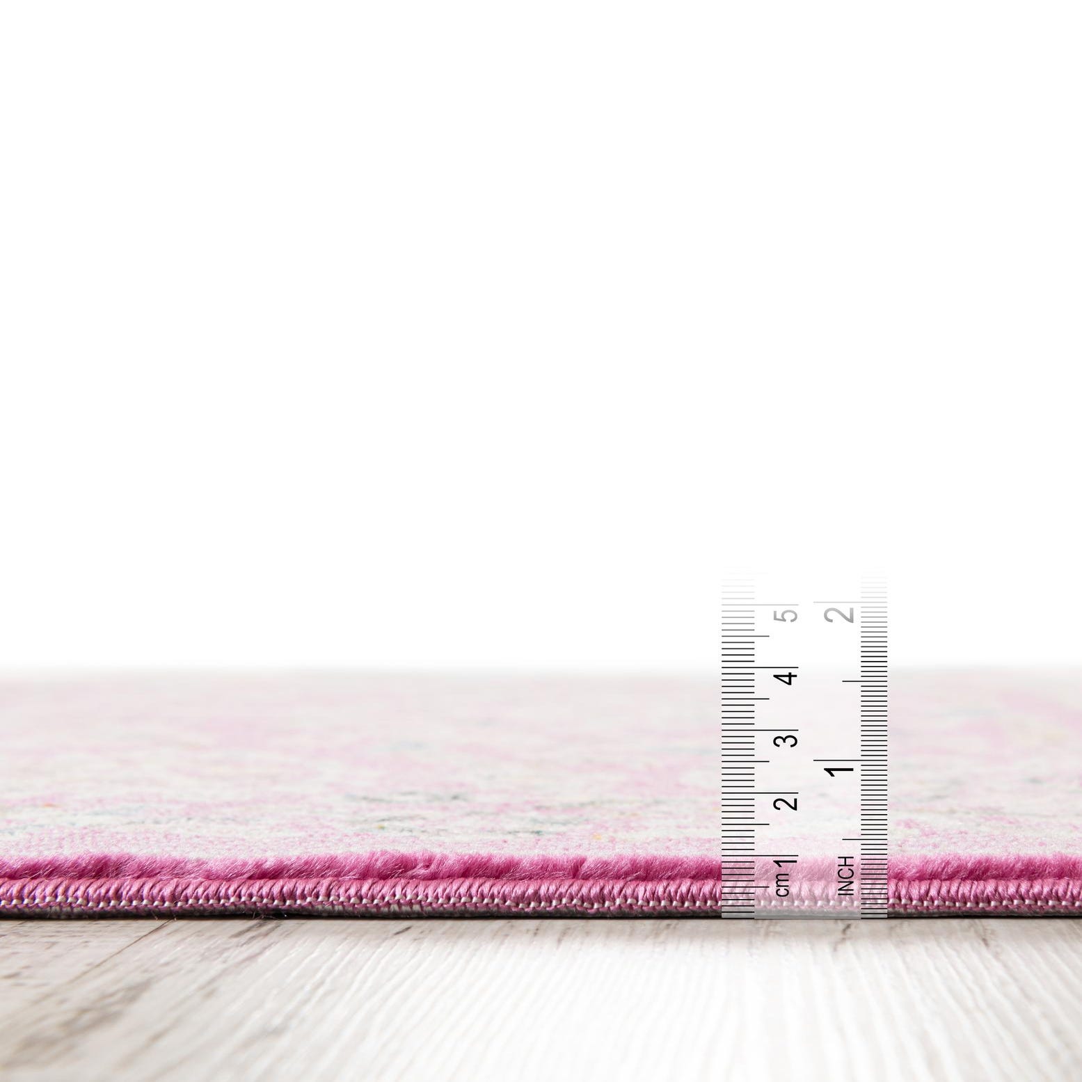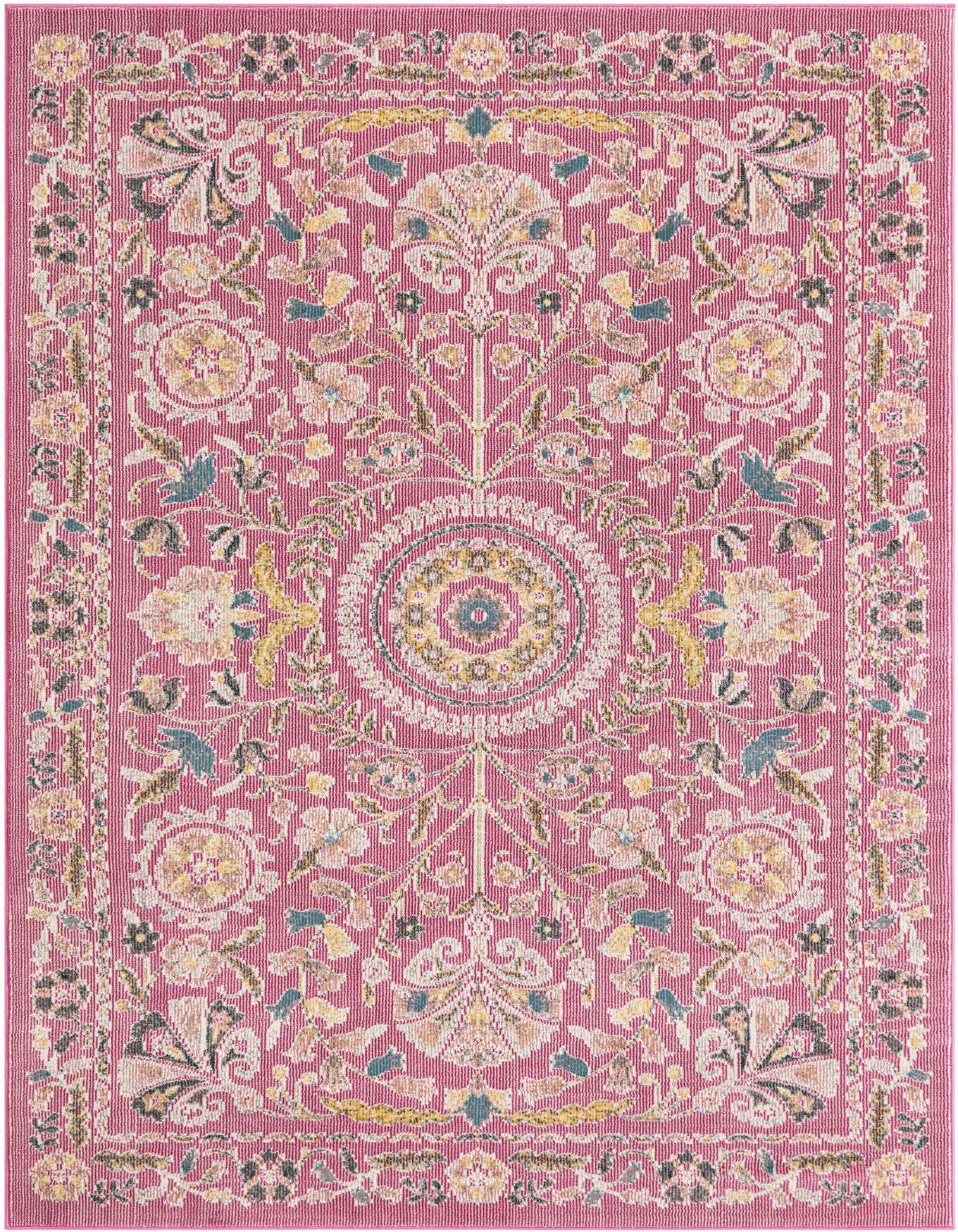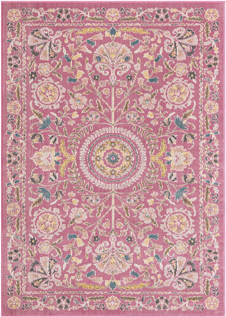 Primary color is Dusty Pink. Colors in this rug include: Dusty Pink, Ivory, Green, Yellow.