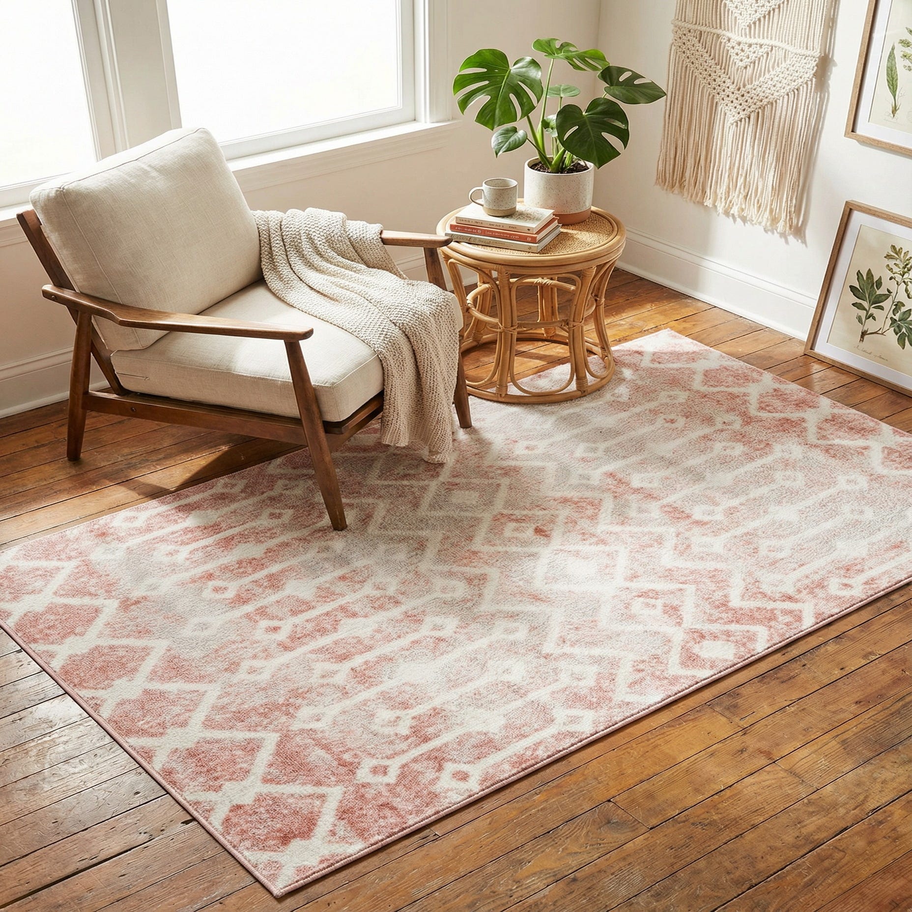Primary color is Dusty Rose. Colors in this rug include: Dusty Rose, Ivory, Gray.