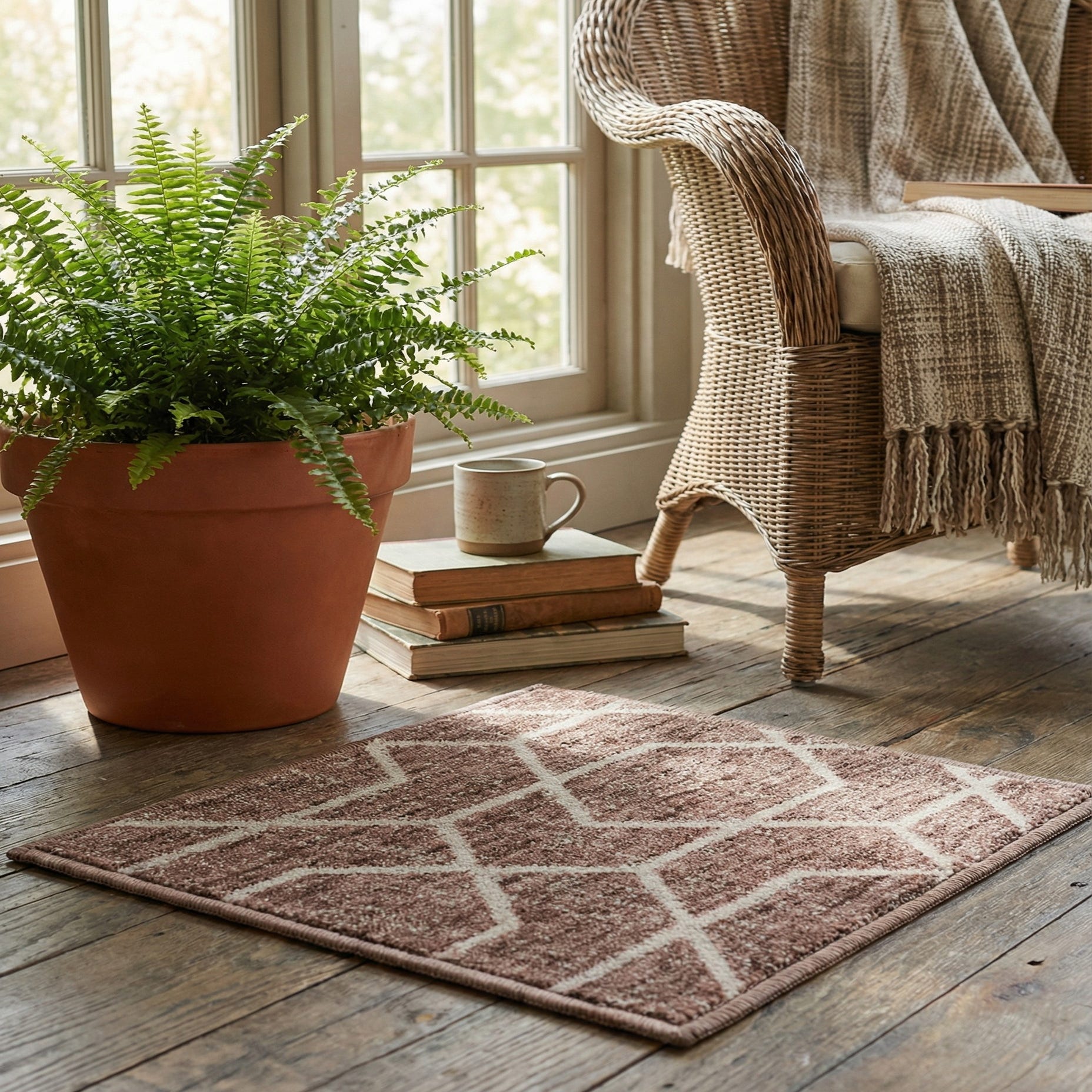 Primary color is Dusty Rose. Colors in this rug include: Dusty Rose, Ivory.