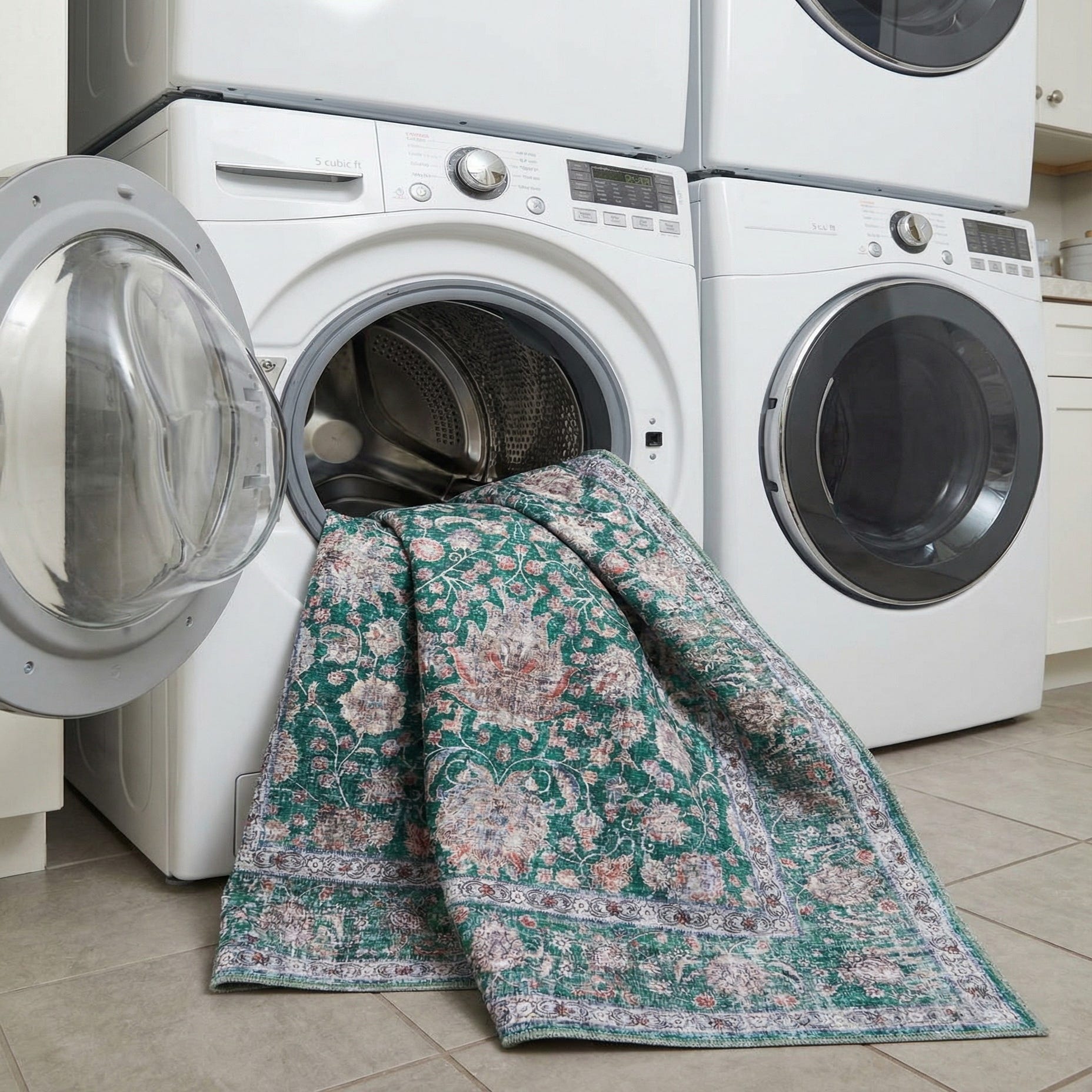Primary color is Emerald Green. Colors in this rug include: Emerald Green, Beige, Blue, Brown, Ivory.