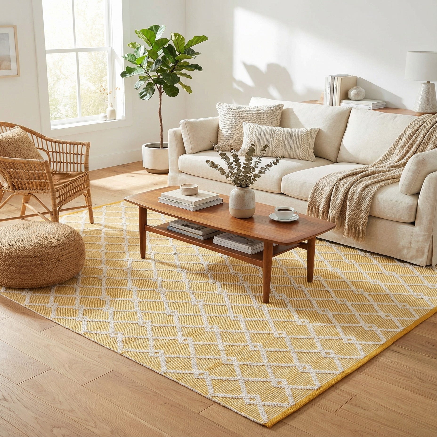 Primary color is English Daisy. Colors in this rug include: English Daisy, Ivory.